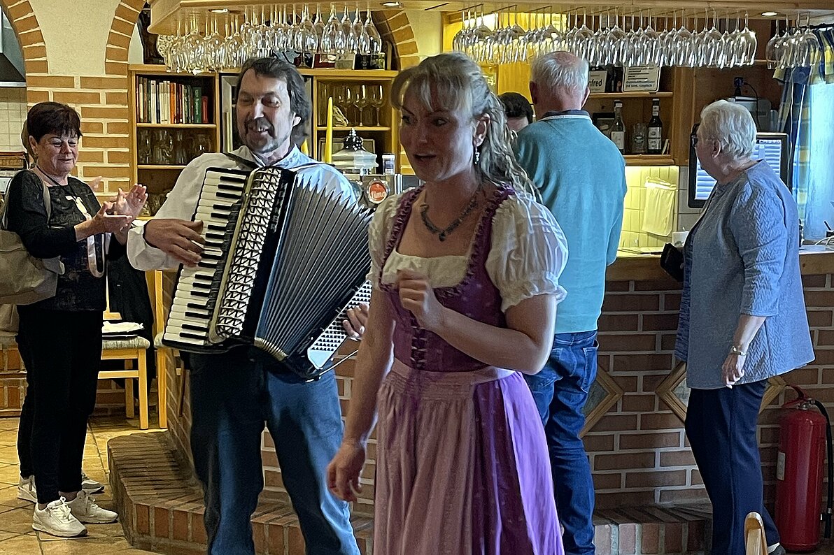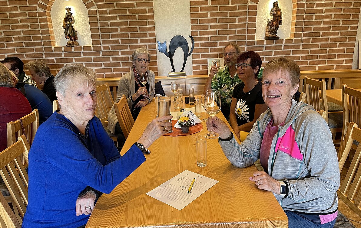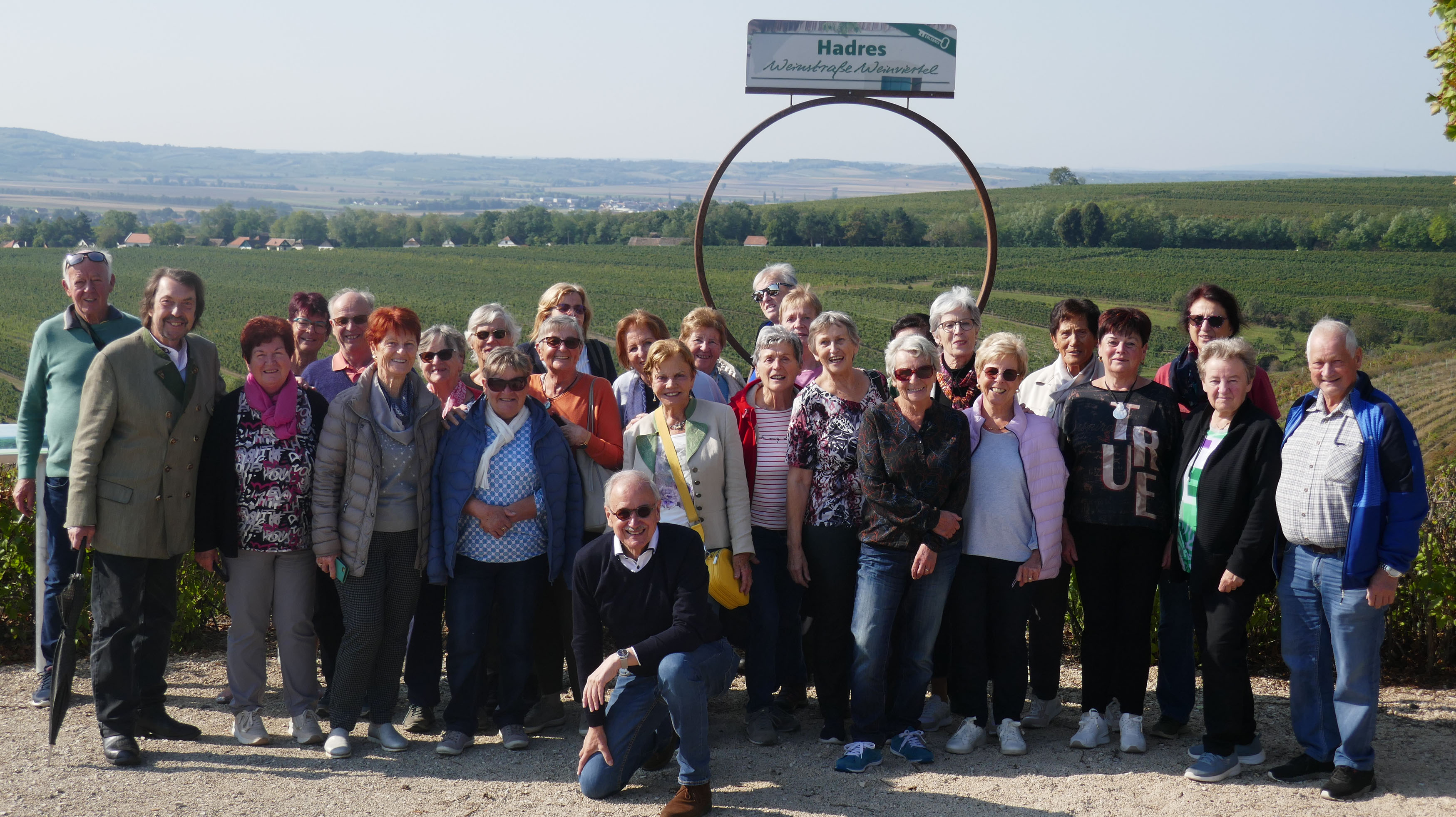Am zweiten Tag stand der Besuch des Aussichtsbergs mit der Friedenskapelle und einer der längsten Kellergassen in Hadres auf dem Programm: schmale Gassen zwischen kleinen idyllischen Häuschen und Kellern, hohe Bäume, weites Land und viele Weinstöcke. Nach der Weinverkostung in Markward-Keller mit kleiner Jause füllte sich der Kofferraum des Busses mit Weinen und Gin vom Weingut Baumgartner. Zum Abschluss tanzten und sangen wir, begleitet vom Theaterdirektor mit seiner Ziehharmonika.