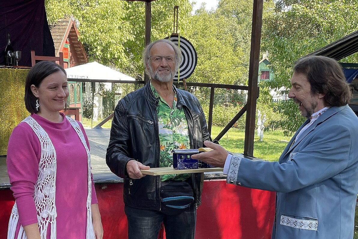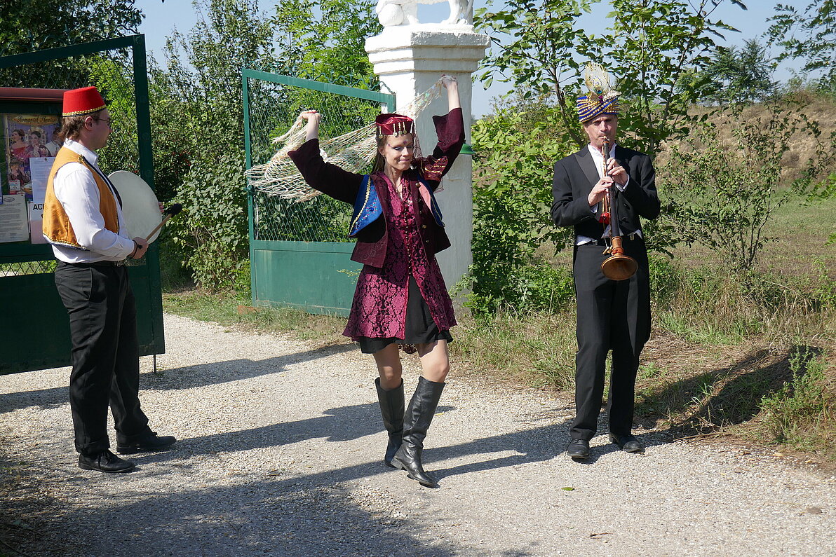 Schon beim Eingang zum Gelände der alten Ziegelei in Untermarkersdorf im nördlichen Weinviertel wurde uns klar, dass wir nun eine andere Dimension betreten. Wir wurden von einem Komitee, bestehend aus zwei orientalischen Musikern und einer Schleiertänzerin empfangen und durch einen verwunschenen Garten geleitet: Zwerge, Elfen, Bäume mit Gesichtern, allerlei alter Hausrat, hinter Hecken versteckte Häuser, eine alte Kapelle, Statuen und ein Oldtimer säumten unseren Weg. Angekommen wurden wir vom Theaterdirektor persönlich mit Sekt begrüßt.