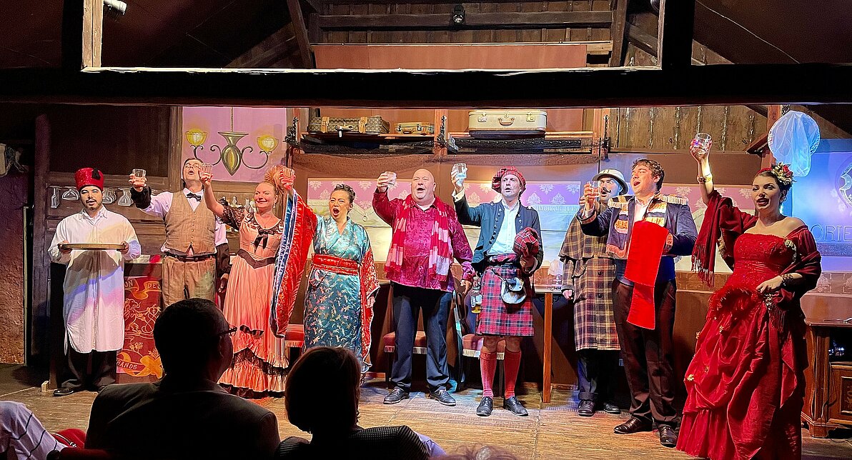 Am Nachmittag erfreute ein symphonisches Kurkonzert mit bekannten, schwungvollen Melodien unsere Ohren und unser Herz. Nach einer weiteren kurzen Pause fand die Aufführung der Operette „Träume im Orientexpress“ mit beschwingter Musik, lustigen Texten und herzerwärmenden Liedern statt. Beim Verlassen des Stadels ging ein heftiges Gewitter mit Regengüssen nieder – irgendwie passend zum ganzen Ambiente. Nach dem Abendessen verließen wir die phantasievolle Parallelwelt und begaben uns in die Wirklichkeit um die Nacht im Studentenheim und Stadthotel in Hollabrunn zu verbringen.