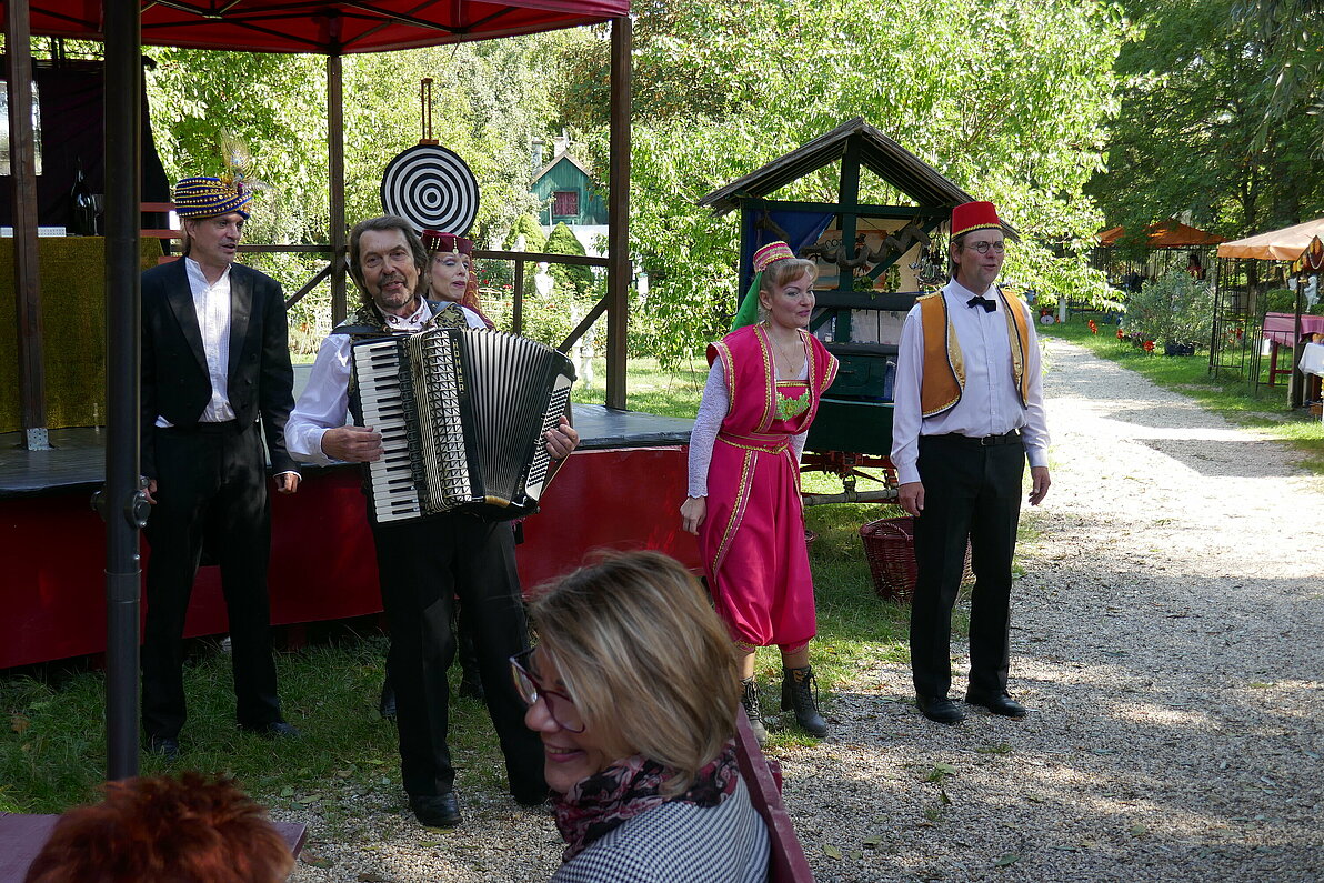 Weiter drinnen in dieser phantastischen Welt nahmen wir in einem idyllischen Gastgarten unter großen Nussbäumen Platz, orderten Getränke und bestaunten einen Zauberer und seine Assistentin. Umgeben von Kunsthandwerk, genossen wir in bequemen Sitzgelegenheiten die freie Zeit bis zum Mittagessen. Dieses wurde uns bald im orientalischen Ambiente einer historischen Taverne serviert.