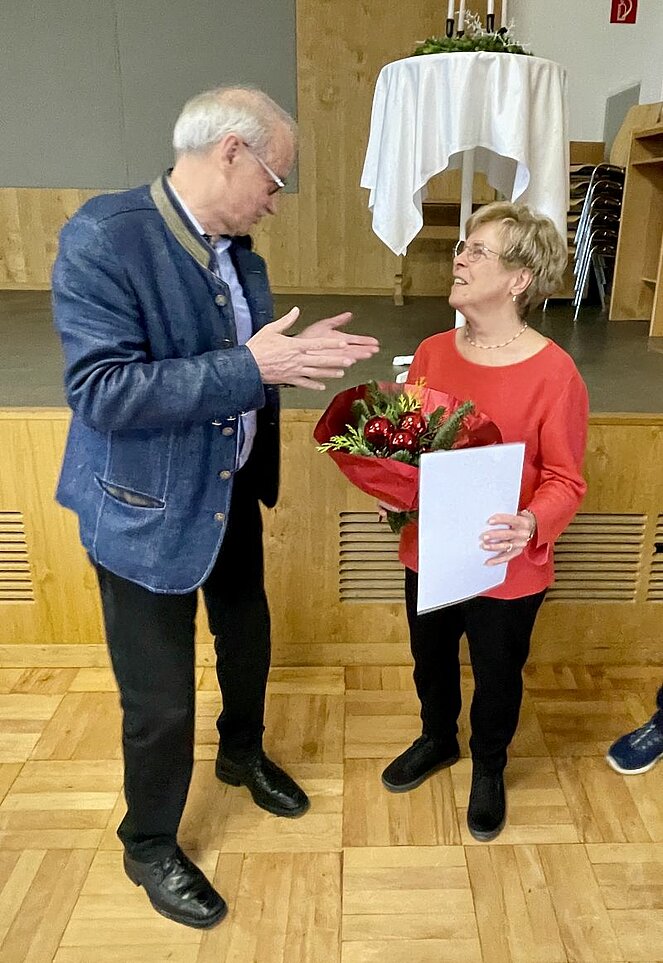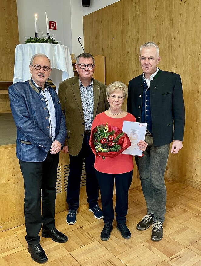 Obmann Sepp Mayr hielt Rückschau auf ein ereignisreiches Vereinsjahr und gratulierte den Dezember – Geburtstagskindern. Bürgermeister Bernhard Weiß bedankte sich für die Arbeit des Vereins, Gemeinderat Stefan Hirsch blickte launig auf die gemeinsame Zeit mit dem PVÖ. Berta Bernegger wurde vom Land für ihre langjährige Mitgliedschaft und ihre Tätigkeit im Vereinsvorstand das goldene Ehrenzeichen verliehen, das ihr unser Obmann, sein Stellvertreter Hansjörg Höllbacher und der Bürgermeister überreichten.
