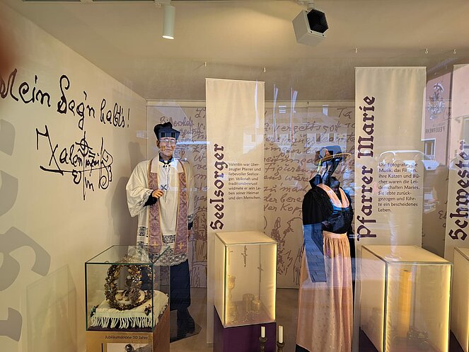 Die Ausstellung beinhaltet das Wirken vom ,,Voitl" als Seelsorger, die künstlerische und humorvolle Inszenierung einer Glaubensverkündung sowie seinen wertschätzenden Umgang mit allen