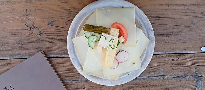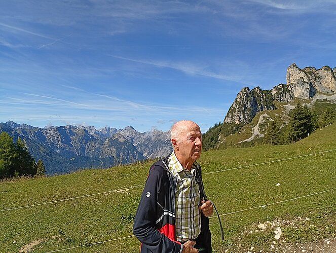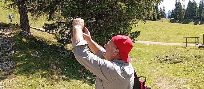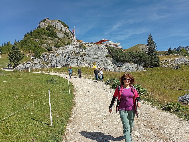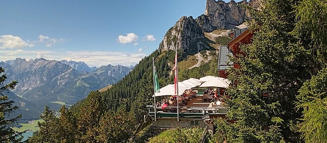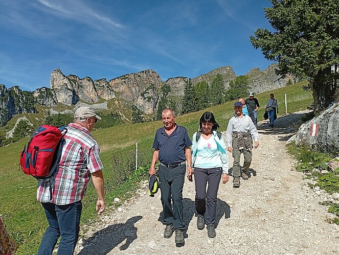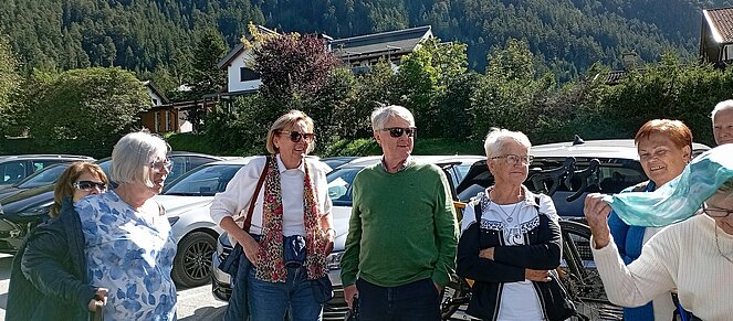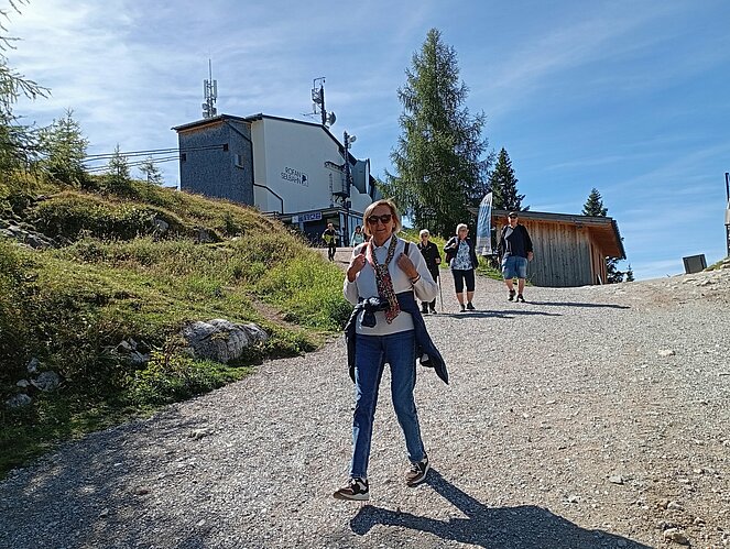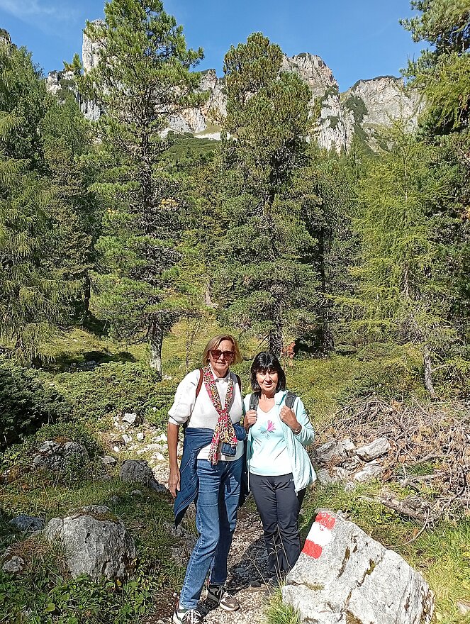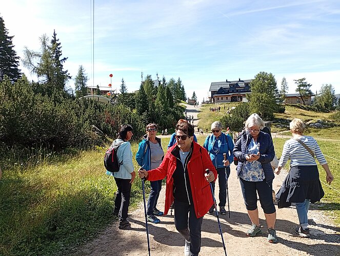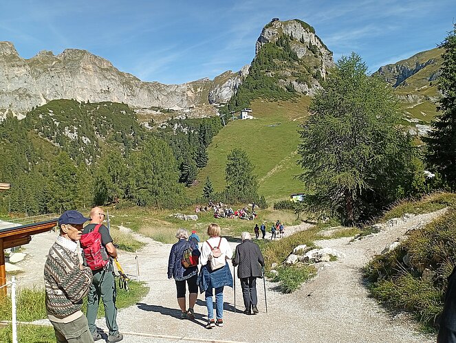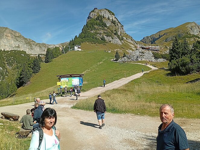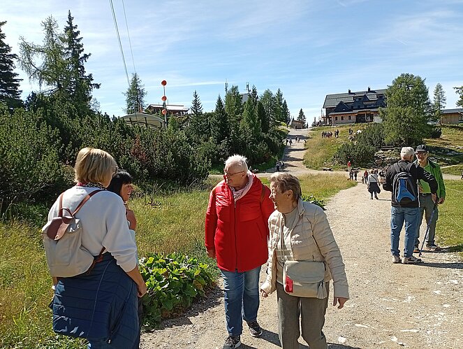Oben angekommen, teilten wir uns in zwei Gruppen. Eine Gruppe von zehn Teilnehmern entschloss sich zu einer 45-minütigen Wanderung zur Dalfazalmhütte, um dort eine gemütliche Mittagspause einzulegen. Die andere Gruppe zog es zur Erfurterhütte.
