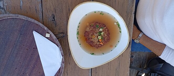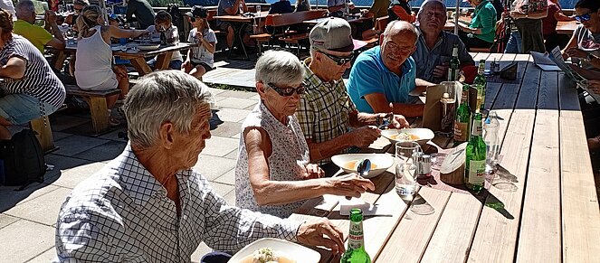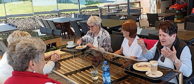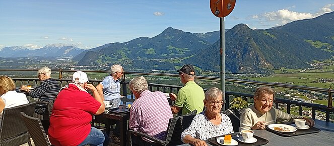 Gegen 14:30 Uhr trafen sich alle wieder bei einer kurzen Fahrt zum Panoramarestaurant "Kanzelkehre". Dort genossen wir auf der sonnigen Terrasse bei Kaffee, Kuchen, Eis, Bier und Wein nicht nur kulinarische Köstlichkeiten, sondern auch einen atemberaubenden Ausblick auf Maurach und das wunderschöne Zillertal.
