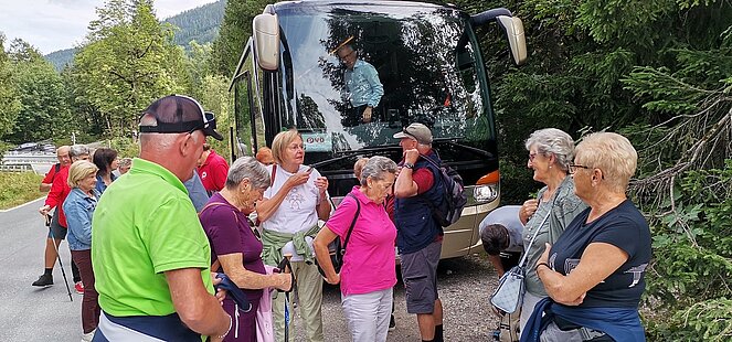 Im Bus erzählt Schlager Sepp etwas über die Geschichte des Jägersees mit seinem 48 m tiefen, kristallklarem Wasser. Dabei erfuhren wir, dass er früher Eilsee hieß und bereits im 17. Jahrhundert durch Aufstauen entstanden ist.