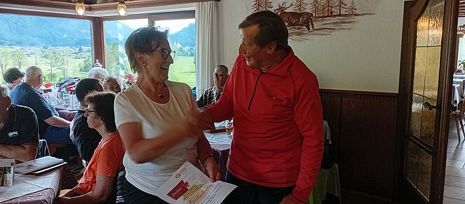 Ein kleines Highlight erwartete uns auch noch im Café: Sepp verloste – wie schon zur Tradition geworden – einen Gutschein für unseren Herbstausflug zum Achensee und ins Rofangebirge am 3. September. Über den Gewinn durfte sich diesmal unser Mitglied Barbara „Blumen Wetti“ Oberauer freuen – herzlichen Glückwunsch!