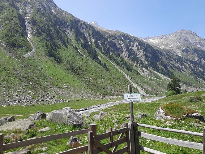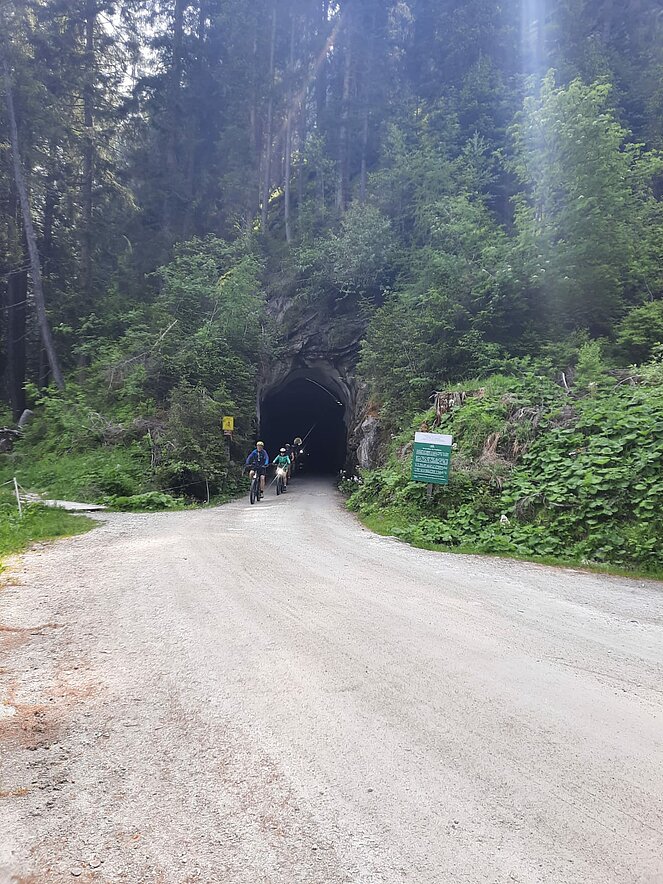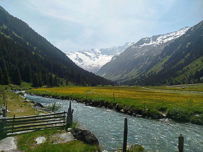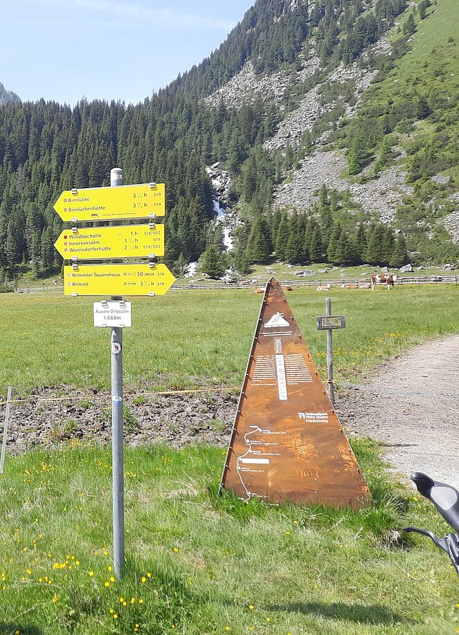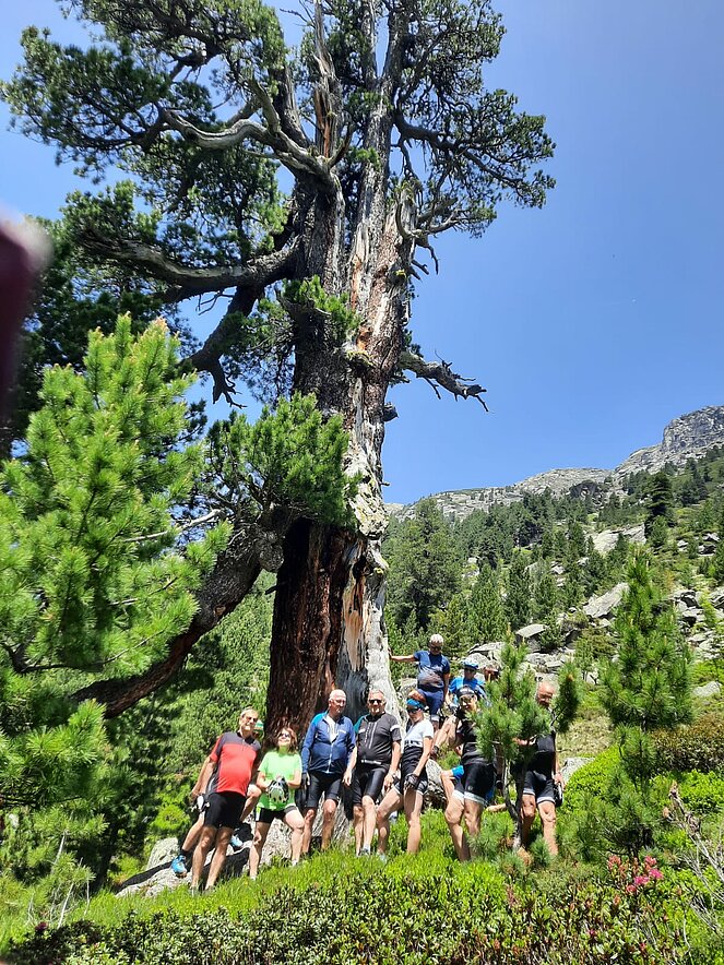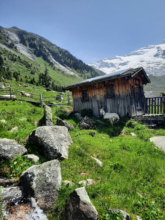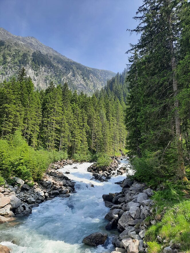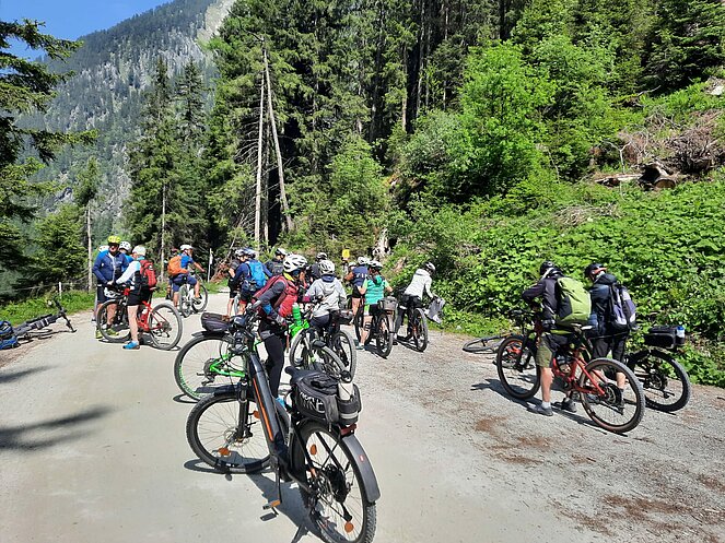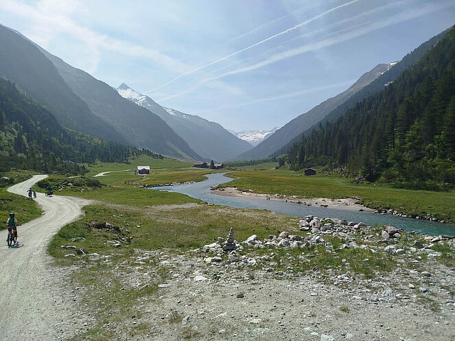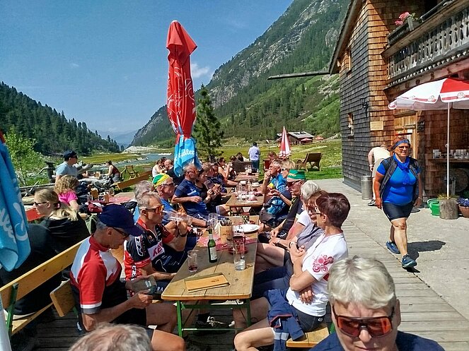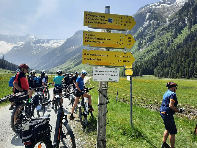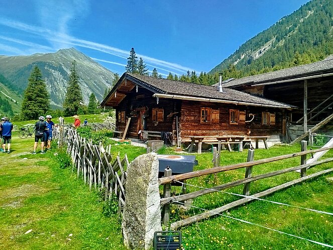 Gegen 10 Uhr begannen wir unsere Tour entlang der Straße, die sich an den Wasserfällen hinaufschlängelt. Oben am Plateau angekommen, wurden wir mit einem traumhaften Blick ins Krimmler Achental belohnt. Wir fuhren etwa 20 Kilometer tief ins Tal hinein. Bei der Südtiroler Hütte legten wir eine wohlverdiente Rast ein. Der Gletscher war zum Greifen nah und auch eine rund 800 Jahre alte Zirbe beeindruckte uns sehr.