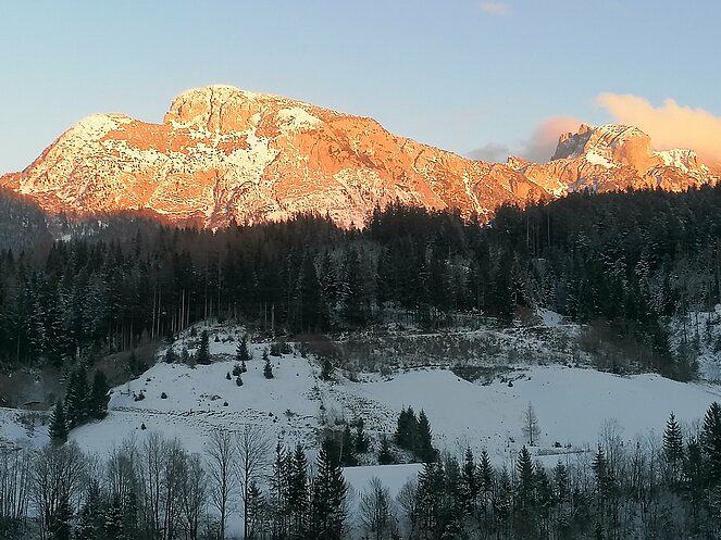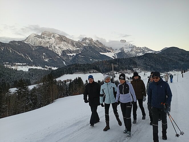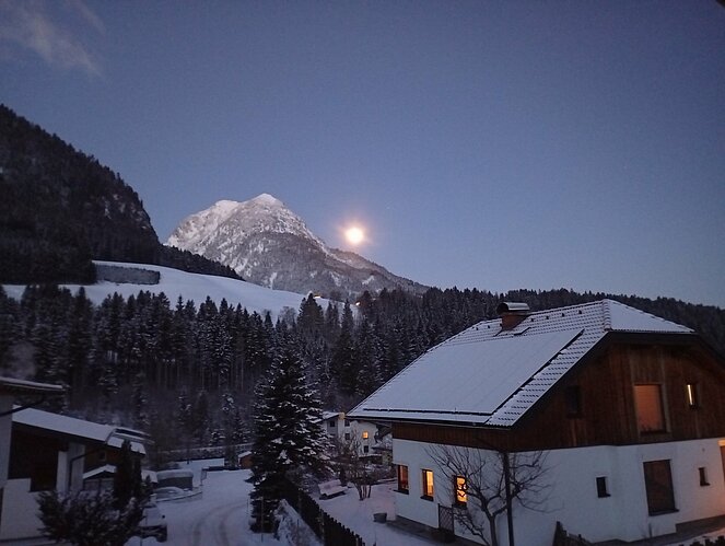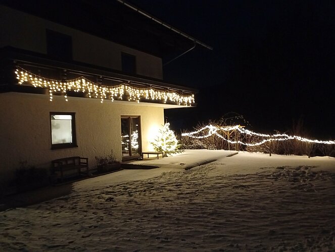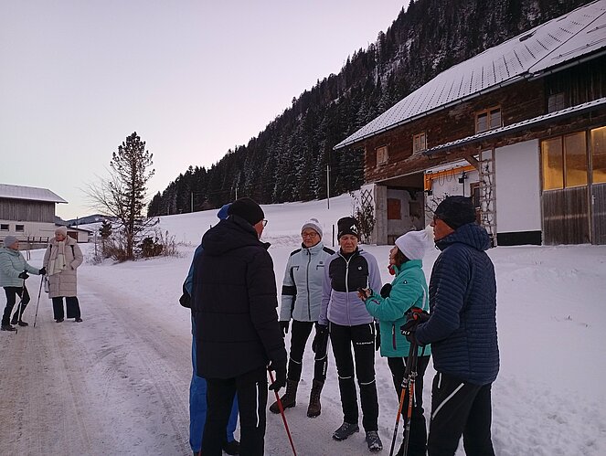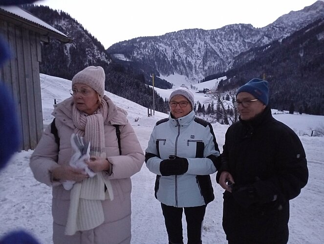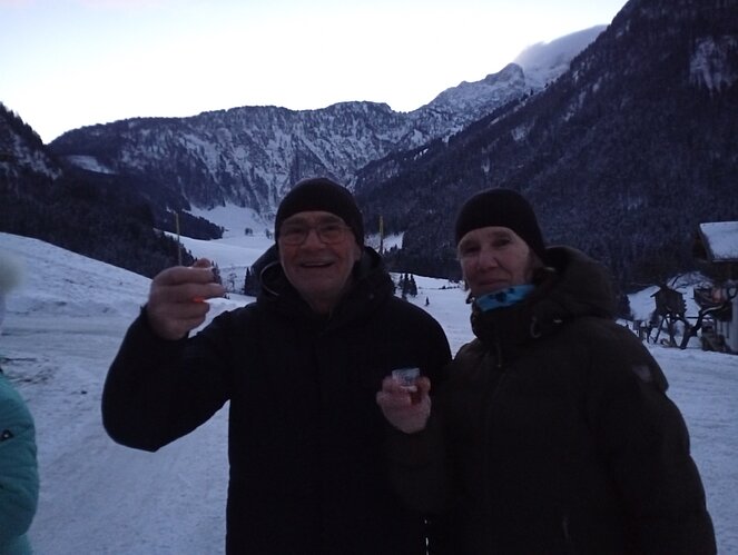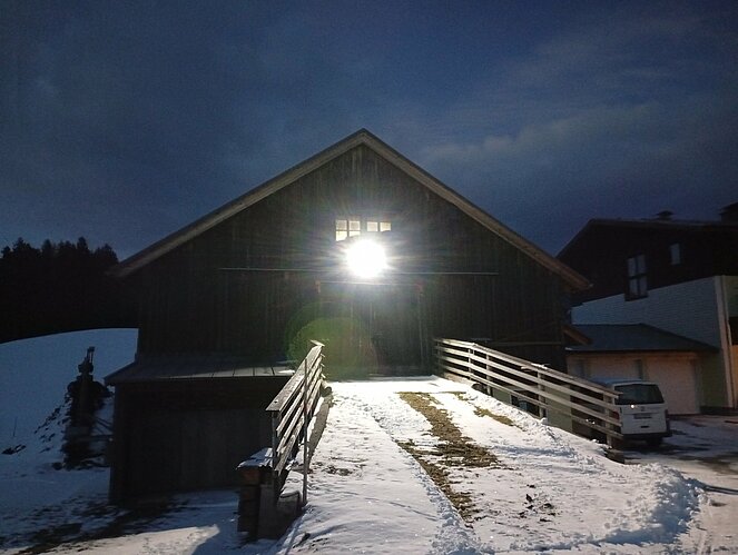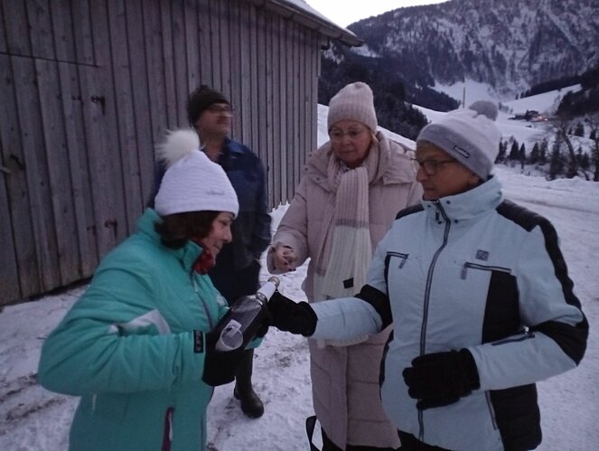 Unsere Zwischenstation erreichten wir beim Strubegg-Bauern, der gerade mit dem Melken seiner Kühe beschäftigt war. Enttäuscht darüber, dass sich der Mond nicht blicken ließ, wusste er jedoch Abhilfe: Kurzerhand schaltete er einen großen, runden Scheinwerfer über dem Scheunentor ein – und schon hatten wir unseren „Vollmond“. Zur zusätzlichen Erwärmung gab es heißen Tee und einen kräftigen Zirbenschnaps.