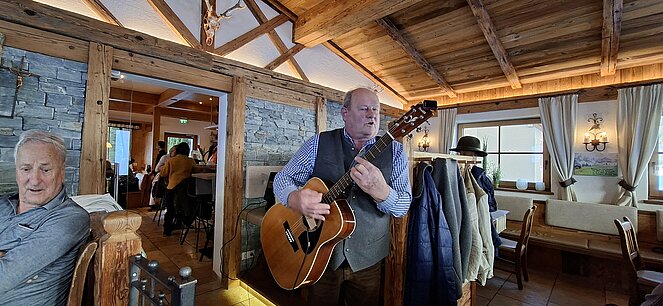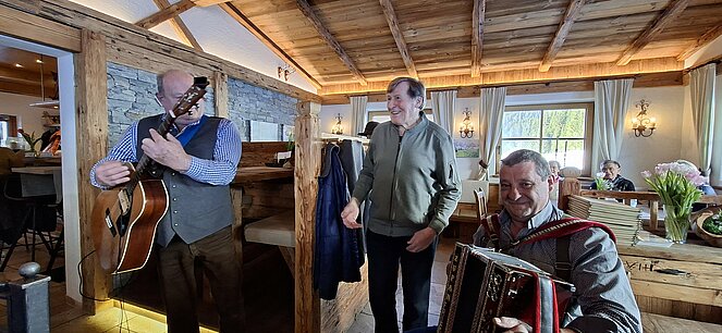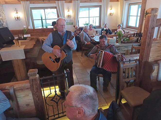 Schon bald bekamen wir musikalische Verstärkung: Der Eibmstoa Franz und der Musiwirt Friedl gesellten sich zu uns, spielten schwungvoll auf und sorgten mit ihren – nicht immer ganz jugendfreien – Witzen für beste Unterhaltung und viele herzliche Lacher.