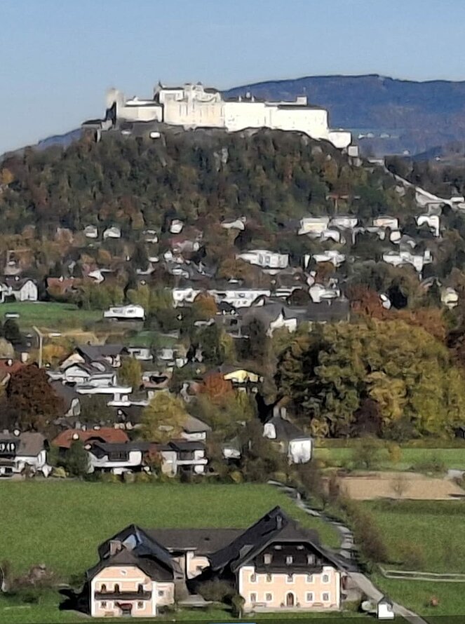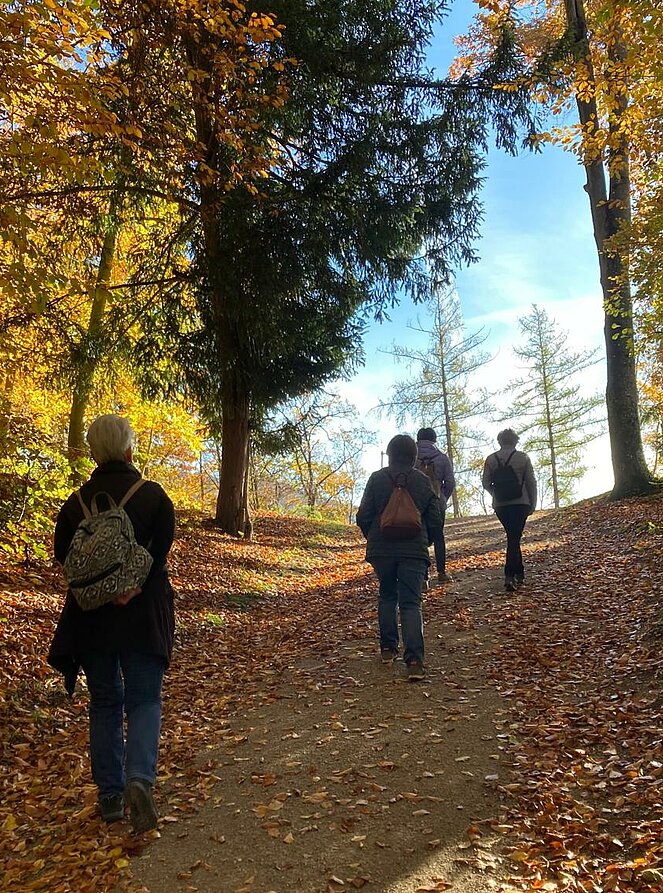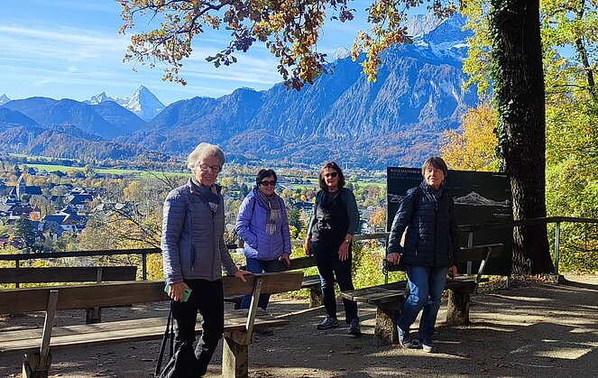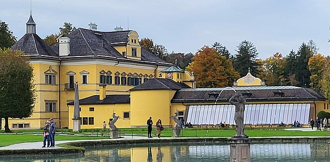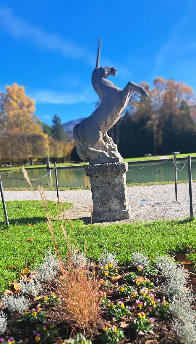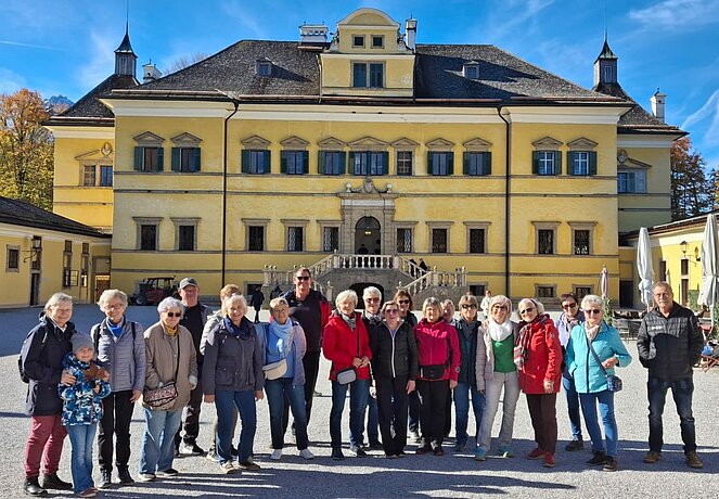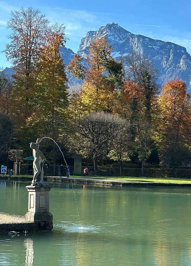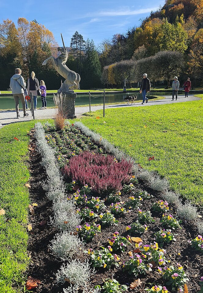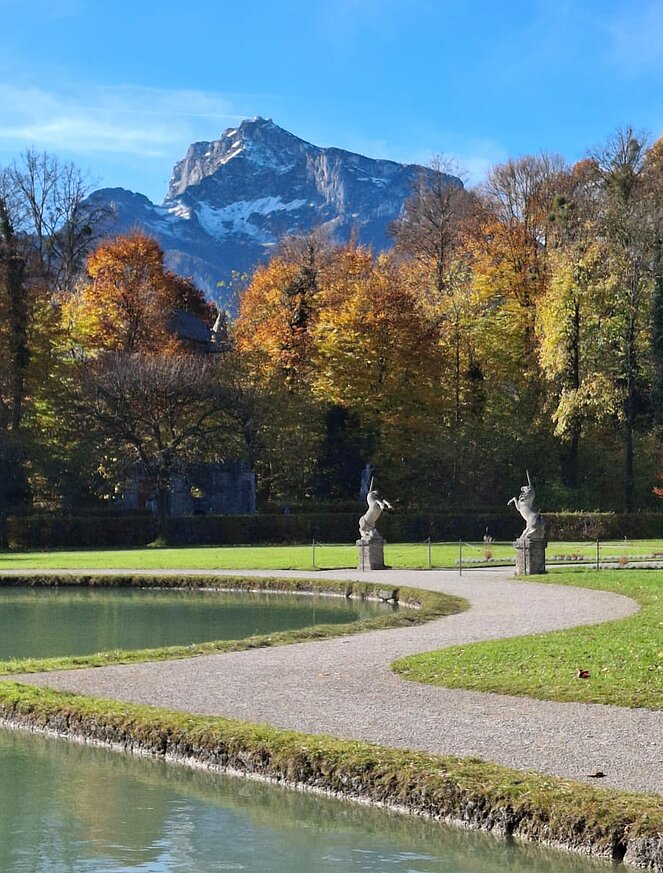 6 Wanderer genossen die herbstliche Parkanlage und der Rest begab sich auf den Hellbrunnerberg. Oben angekommen legten sie eine kleine Pause ein und genossen den tollen Ausblick auf die Umgebung. Weiter ging's zum Steintheater, mit seiner beeindruckenden Naturkulisse, die einst für barocke Aufführungen genutzt wurde. Nach 1,5 Stunden trafen sich beide Gruppen wieder im Park.