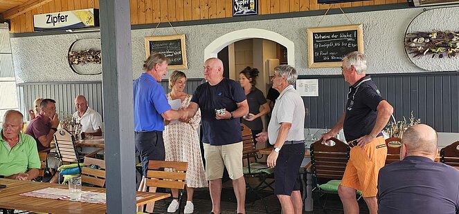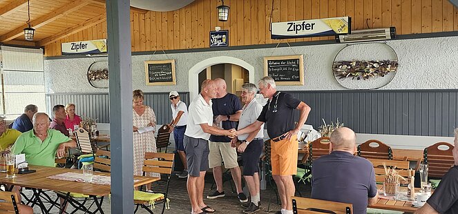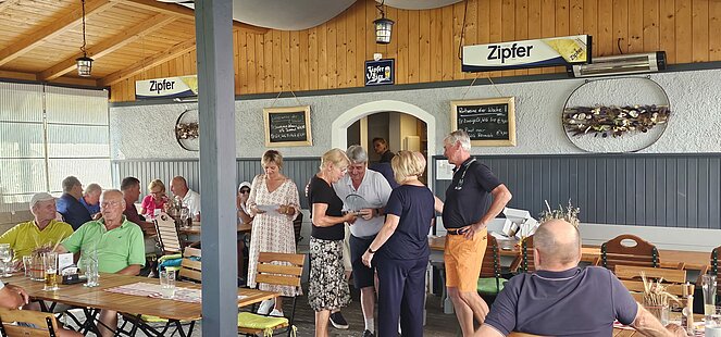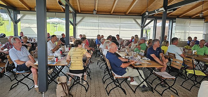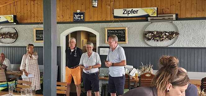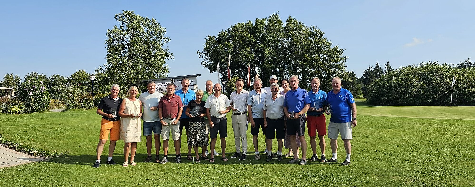 Nach dem Reihenstart ab 10.00 Uhr fanden sich alle Teilnehmer ab ca. 15.00 Uhr langsam im Außenrestaurants des Golfclubs ein – erhitzt und glücklich nach einem wunderschönen Golf-Tag. Die Siegerehrung wurde von Landespräsidenten Wolfgang Höllbacher gemeinsam mit den Mitorganisatoren Christian Hausberger und Otto Lapuch und Clubchefin Gudrun vorgenommen, die Ergebnisse sind auf unserer Homepage unter pvoe.at/salzburg abrufbar. Nach einem schmackhaften Eierschwammerlragout mit Knödel und Salat klang der Tag bei dem einen oder anderen kühlen Bier auf der Clubterrasse gemütlich aus.