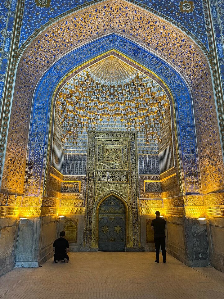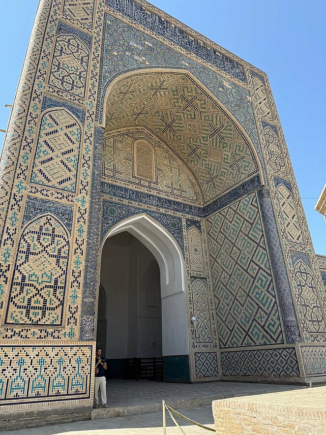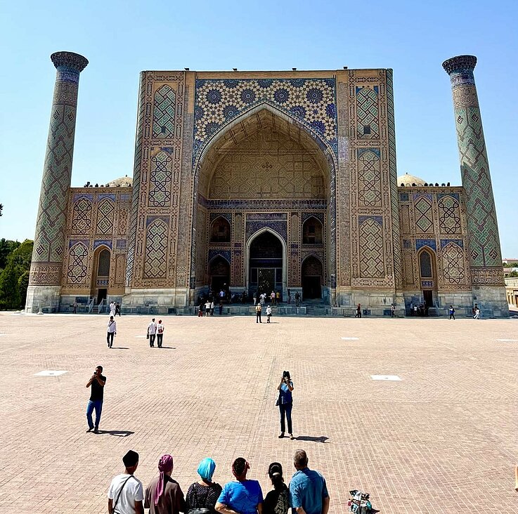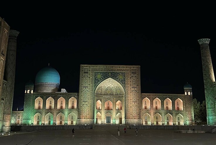 Nach dem Frühstück setzen Sie Ihre Besichtigung im faszinierenden Samarkand fort und besuchen die Nekropole Shah-I-Sinda, die größte Kultstätte Zentralasiens. Die von Timur für Familie und Weggefährten erbaute Gräberstadt im Norden Samarkands ist eine der interessantesten Zeugnisse für die Vielfalt und Schönheit timuridischer Baukunst. Außerdem besichtigen Sie die Moschee Bibi Chanum, eines der größten Bauwerke seiner Art in der islamischen Welt. Die Hauptmoschee wurde innerhalb von 5 Jahren von 1399 bis 1404 erbaut. Genießen Sie außerdem die Faszination eines orientalischen Basars. Sie besichtigen das prächtige Gur Emir Mausoleum („Grab des Gebieters“), die Grabstätte Timurs und den berühmten Registanplatz mit den 3 prächtigen Medressen Ulugbek (1417-1420), Tilla Kori (1641-1660) und Scher Dor (1619-1632). Dieses Ensemble ist das bekannteste Wahrzeichen Usbekistans und gehört zum UNESCO-Weltkulturerbe. Für viele gehört er zu den schönsten Plätzen der Welt. Anschließend folgt ein besonderer Höhepunkt! Sie sind bei einer usbekischen Familie zum Abendessen eingeladen. Dabei haben Sie die Gelegenheit, die Traditionen einer einheimischen Familie kennenzulernen. Gemeinsam kochen Sie das usbekische Nationalgericht Plov. (F, A)