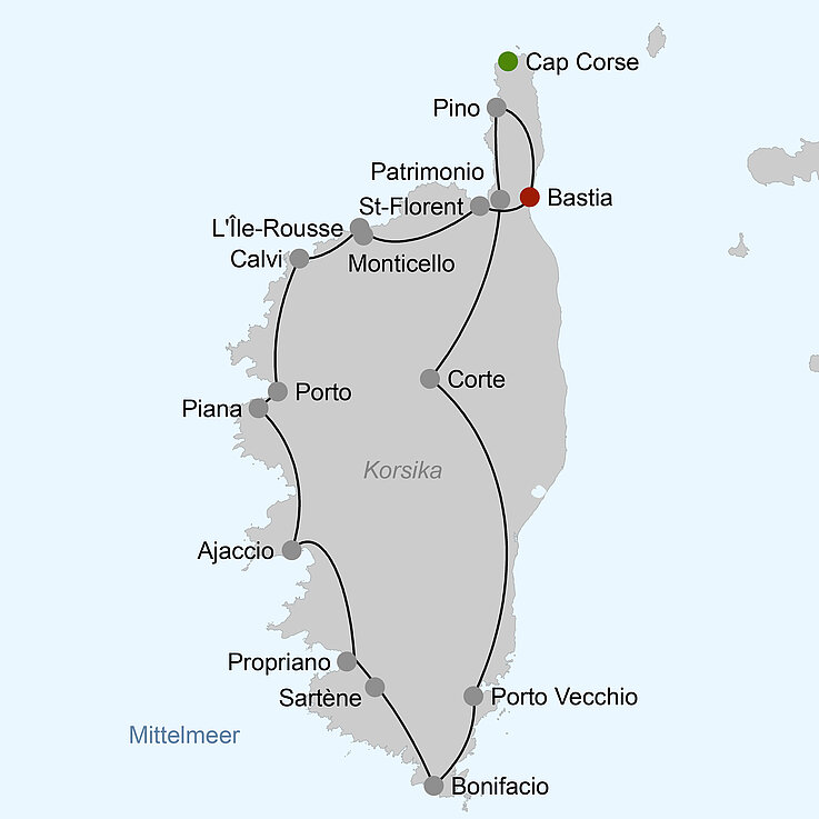 Erleben Sie während dieser Reise die Kontraste zwischen den Küsten und den Bergen auf der romantischen Mittelmeerinsel Korsika, die alle Eigenschaften eines kleinen Kontinents hat: von den Yachthäfen hoch zu den Bergdörfern, an Felsenklippen und Sandstränden entlang, durch Reben und Wälder in schön erhaltener Natur. Der berühmte Duft der Macchia und das milde Klima geben der Insel ein besonderes Flair.