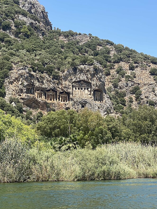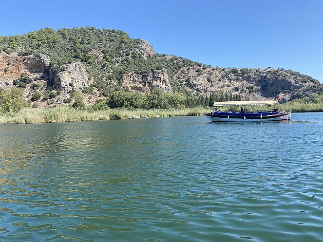 Die Fahrt führt Sie durch Gökova, dem Naturschutzgebiet mit seinen bekannten Eukalyptusbäumen. Der Höhepunkt dieses Ausfluges ist eine Flussfahrt durch die Schilflandschaft entlang der berühmten Felsengräber, die majestätisch die Felsformationen schmücken. Man hat das Gefühl, man schippert im Neusiedler See, doch auf einmal öffnet sich die Mündung des Dalyan Deltas, wo das Süßwasser auf das Salzwasser trifft.