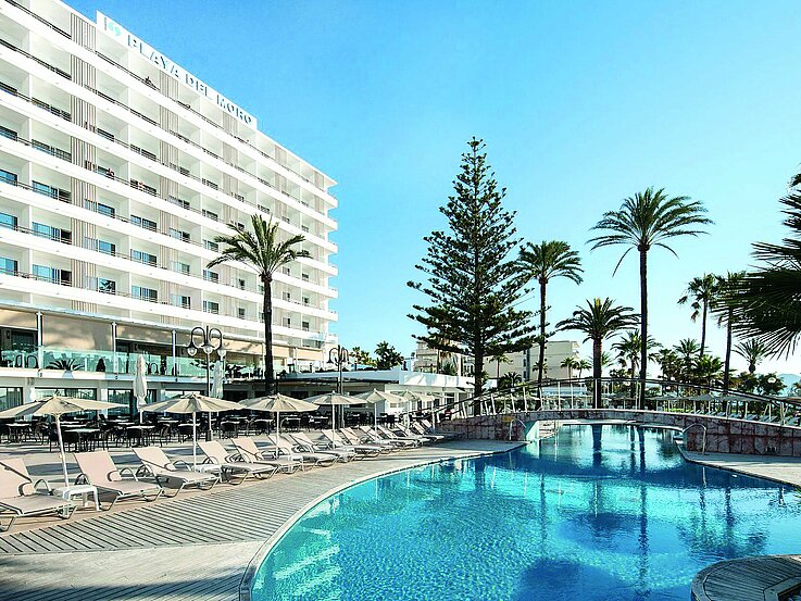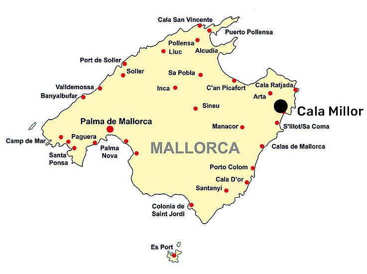 Das 4*-Hotel CM Playa del Moro liegt direkt am Meer. Es ist nur durch den Hotelgarten und die Uferpromenade vom feinsandigen Strand von Cala Millor getrennt. Zur beliebten Fußgängerzone mit zahlreichen Einkaufs- und Unterhaltungsmöglichkeiten sind es nur wenige Schritte. Eine Linienbushaltestelle ist in der Nähe. Die Transferzeit vom Flughafen Palma zum Hotel beträgt ca. eine Stunde.