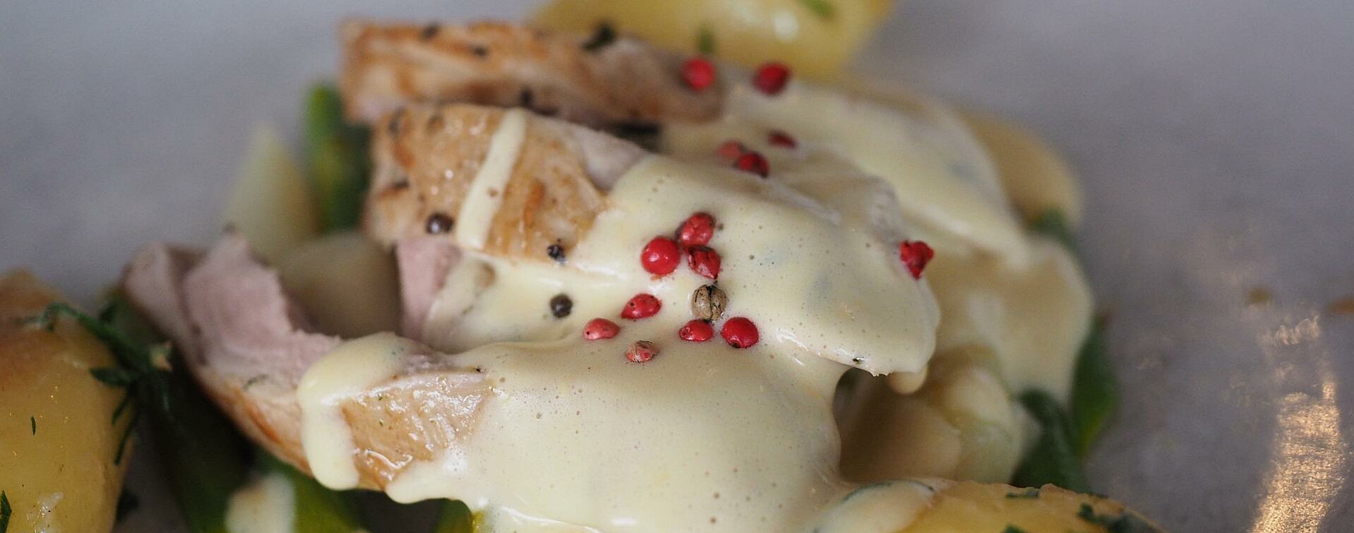Die Filets salzen und in einer Pfanne goldbraun braten. Aus der Pfanne nehmen und warmhalten. Im selben Öl, in dem die Filets gebraten wurden, die klein gehackte Zwiebel und den Knoblauch einige Minuten lang andünsten. Anschließend den Brandy hinzugeben und köcheln, bis der Alkohol verdampft ist. Danach den Käse, das halbe Glas Obers und den Thymian hinzugeben und köcheln lassen, bis die Soße dickflüssig ist. Sobald die Soße eingekocht ist, die Filets zugeben und erhitzen.