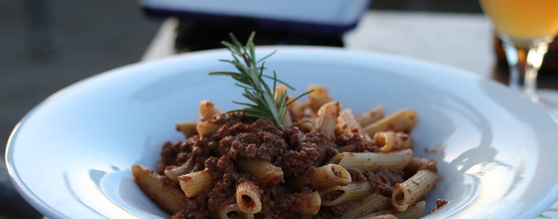 - In einem extra Topf die Makkaroni kochen und nach dem Abgießen diese in einem tiefen Teller mit dem fertig geschmorten Fleisch anrichten.