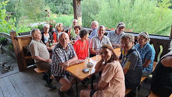 Nach der Rückkehr zum Schwammerlwirt hatten alle eine kulinarische Stärkung notwendig. Auf der Sonnenterrasse genossen wir die Fernsicht ins Mürztal und ließen den schönen Tag ausklingen.