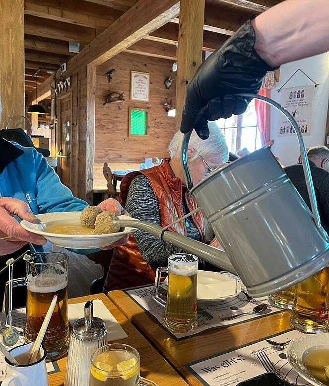 In der Almhütte wartete eine große Anzahl an Knödelgerichten – von verschiedene Knödel in der Suppe über Fleischknödel bis hin zu süßen Knödelvarianten, bei denen man sich ausgiebig durchkosten konnte.