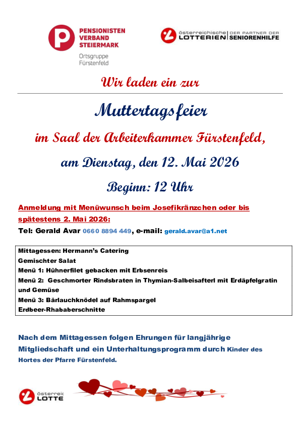 Im Kulturhaus Fürstenfeld wurde dieser Tage vom PVÖ OG Fürstenfeld eine Muttertags- und Vatertagsfeier organisiert. Der Obmann Dr. Martin Wabl konnte mit seinem Team nahezu 100 Damen und Herren herzlich zu dieser Feier begrüßen. Es wurde ein ausgezeichnetes Mittagessen serviert, die Schülerinnen und Schüler des Hortes präsentierten ein gelungenes Programm mit Liedern, Musikstücken und humorvollen Schmankerln allen Anwesenden.