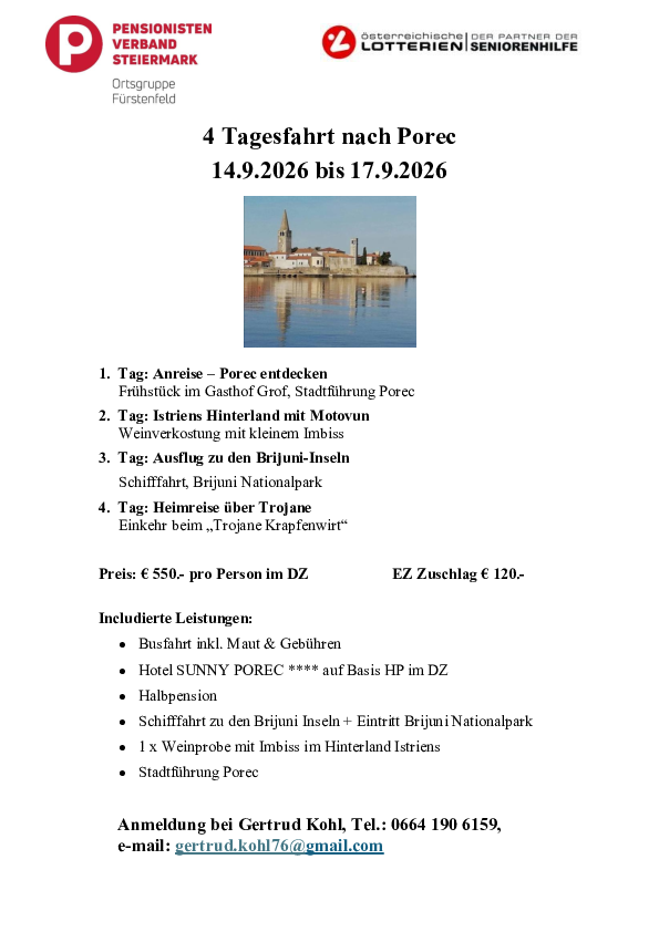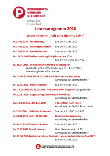 Unsere nächste Veranstaltung findet am Dienstag, 03.12.2024 im Saal der AK Fürstenfeld mit Beginn 14.00 Uhr statt. Wir freuen uns auf Euren Besuch.
