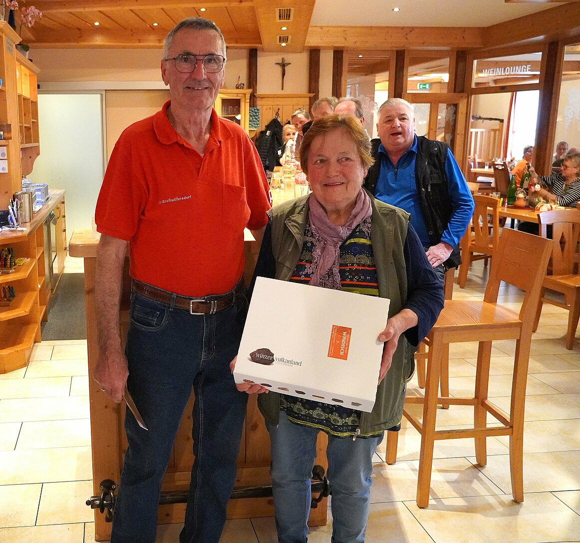 Margit und Gerhard Gruber veranstalteten ein Schätzspiel, bei dem es galt die Anzahl der Körner eines großen Kolbens Mais zu erraten galt. Bester Schätzer und glücklicher Gewinner einer großen Stange Wurst war Bezirksvors. Manfred Hafner, an 2.Stelle folgte ihm Bezirks-Schriftführer Raimund Scher. An 3.Stelle lag Sylvia Hermann (OG Fürstenfeld) mit ihrer Schätzung richtig. Die Beiden freuten sich über den Gewinn von ein paar Flaschen exzellenten Weines.