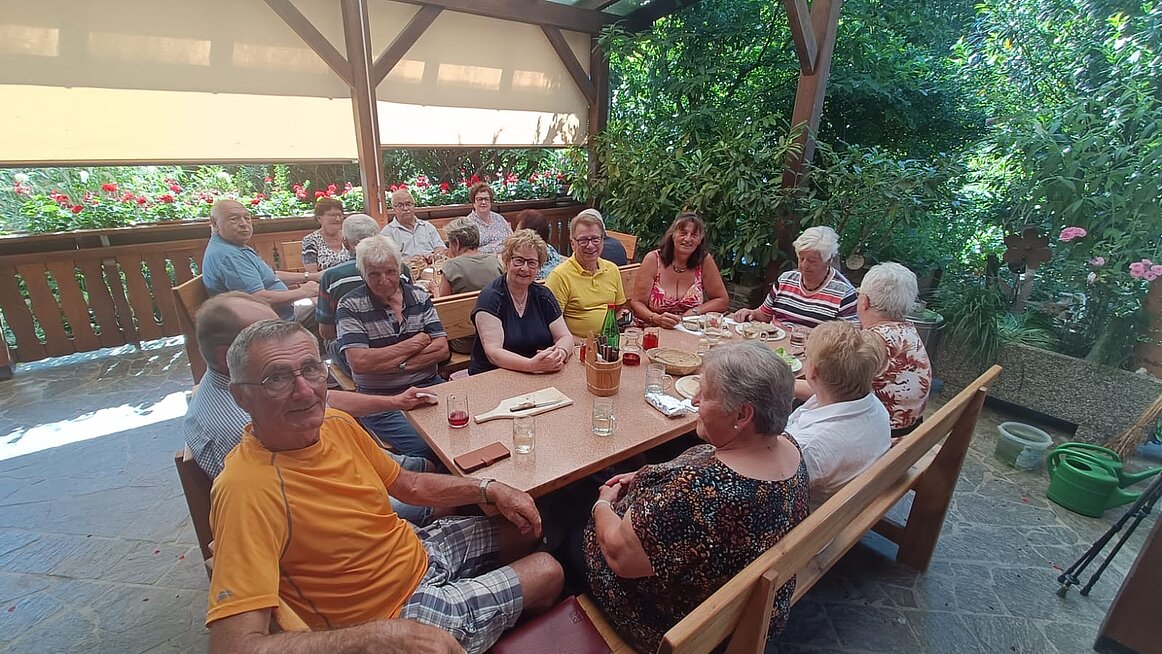 22 Mitglieder freuten sich am Samstag, dem 5. Juli über ein Wiedersehen auf der kühlen Terrasse des Buschenschank Schibich in Reigersberg. Es wurde ein entspannter Nachmittag, bei dem mancher Spritzer verkostet und gute Jausen gegessen wurden. Es wurde viel gelacht, gescherzt und Neuigkeiten wurden ausgetauscht.