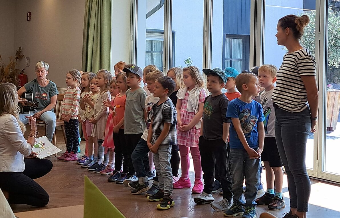Die Kinder hatten für jede Mutter eine Karte gebastelt, Margit Z. hatte rote Tulpen für die Damen und gelbe Rosen für die Herren besorgt. Karte und Blumen wurden von den Kindern mit großem Eifer ausgeteilt. Die Besucher bedankten sich mit tosendem Applaus dafür.
