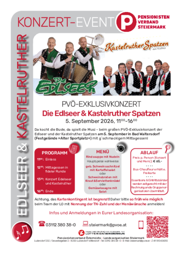 Am Samstag, 5. September 2026 erwartet uns in Bad Waltersdorf (Festgelände – Alter Sportplatz) ein ganz besonderes Highlight: ein exklusives Konzert für den PVÖ mit zwei der beliebtesten Musikgruppen im deutschsprachigen Raum – Die Edlseer und die Kastelruther Spatzen.