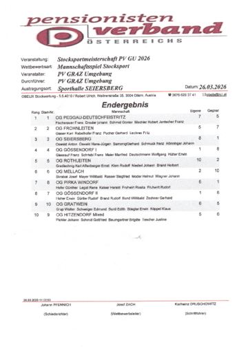 Wettbewerbsart war auch heuer wieder das Mannschaftsspiel, bei dem sich das Team der OG Deutschfeistritz (Franz Fischerauer, Johann Draxler, Günter Schmid, Hubert Machler und Franz Jantscher) den 1.Platz sicherte, gefolgt vom Team Frohnleiten (Karl Glaser, Franz Rabelhofer, Gerhard Pucher und Fritz Lechner) auf Platz 2 und dem Team Seiersberg (Anton Oswald, Hans-Jürgen Oswald, Gerhard Samonig, Franz Schmuck und Johann Hönninger) auf dem 3.Platz.