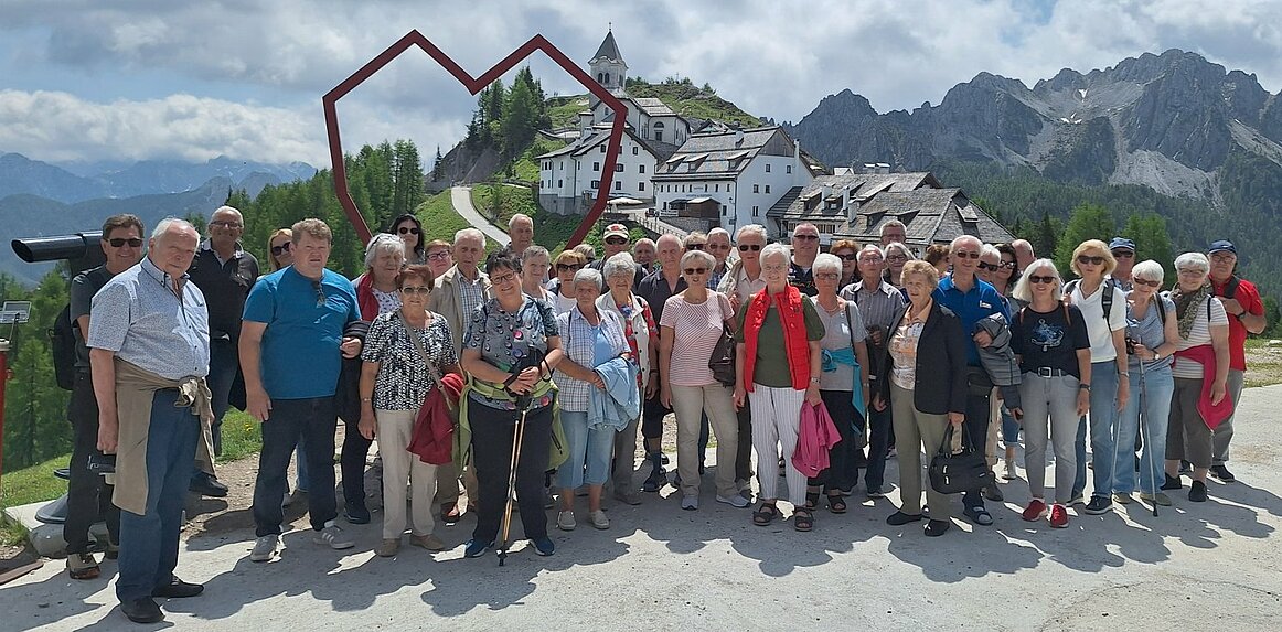 Die Reise zu Pfingsten (6./7. Juni) führte uns nach nach Tarvis. Mit der Gondel fuhren wir auf den Monte Lussari. Der Marienwallfahrtsort zeigte sich von seiner sonnigen Seite. Nach dem Mittagessen im Refugio besuchten wir die Kirche und die zahlreichen Souvenierläden.