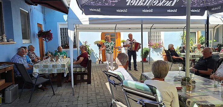 Anschließend fuhren wir ins Himmelsreich (Buschenschank Schaberl) zur Likörverkostung. Als Unterlage diente ein sehr gut belegtes Brot. Gesanglich wurden wir von Amalia Pfundner (Gründerin der Raabtaldirndln) unterhalten. Begleitet wurde sie von Ludwig Müller auf seiner “Steirischen”. Der Tag ging viel zu schnell vorüber.
