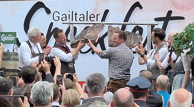 Frisch und munter, nach einem reichhaltigen Frühstücksbuffet, ging es nach Hermagor zum Gailtalter Speckfest. Viele Besucher erzeugten eine richtige Jahrmarktstimmung. Der offizielle Beginn des Speckfestes erfolgte durch den Speckanschnitt.