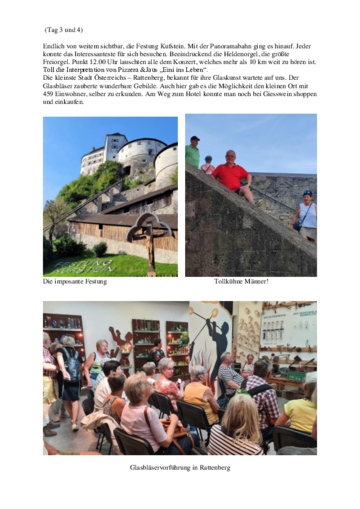 Die Schifffahrt am Achensee, dem Meer Tirols, von Pertisau bis Scholastika rundete den Tag ab. Endlich von weitem sichtbar, die Festung Kufstein. Mit der Panoramabahn ging es hinauf. Jeder konnte das Interessanteste für sich besuchen. Beeindruckend die Heldenorgel, die größte Freiorgel. Punkt 12.00 Uhr lauschten alle dem Konzert, welches mehr als 10 km weit zu hören ist. Toll die Interpretation von Pizzera & Jaus „Eini ins Leben“.