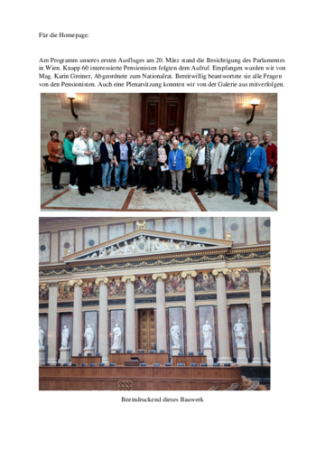 Am Programm unseres ersten Ausfluges am 20. März stand die Besichtigung des Parlamentes in Wien. Knapp 60 interessierte Pensionisten folgten dem Aufruf. Empfangen wurden wir von Mag. Karin Greiner, Abgeordnete zum Nationalrat. Bereitwillig beantwortete sie alle Fragen von den Pensionisten. Auch eine Plenarsitzung konnten wir von der Galerie aus mitverfolgen.