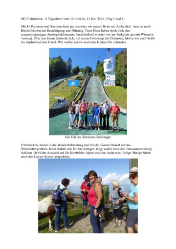 Mit 41 Personen und Sonnenschein pur starteten wir unsere Reise ins Alpbachtal. Anreise nach Bischofshofen mit Besichtigung und Führung. Trotz Hitze haben doch viele den serpentinenartigen Anstieg erklommen. Anschließend wurden wir am Parkplatz gut mit Würsteln versorgt. Über das kleine deutsche Eck, mit einem Fotostopp am Chiemsee, fuhren wir nach Reith ins Alpbachtal zum Hotel. Wer wollte, konnte noch den kleinen Ort erkunden.