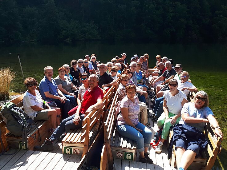 53 PV Mitglieder trafen sich am 17.08. pünktlich zur Abfahrt nach Gößl am Grundlsee. Nach rund 2 Stunden Busfahrt erreichten wir unser Ziel. Vom Parkplatz weg führte uns eine halbstündige, gemütliche Wanderung zum Toplitzsee. Von der dortigen „Fischerhütte“ wurden wir von 2 „Plätten“ über den 1,9 km langen See gefahren. Während der Fahrt erzählte uns der Bootsführer viel Interessantes über den See, aber auch über den schwierigen und mühsamen Holztransport vom Kammersee zum Toplitzsee.