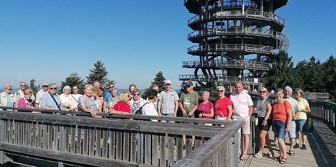 Mittwoch, der 4. Tag, war der Heimreisetag. Nach dem Frühstück und dem herzlichen Abschied von den Wirtsleuten führte uns das letzte Ziel zum Waldwipfelweg in Sankt Englmar. Ein barrierefreier Steg bis hinauf in luftiger Höhe von 55 Meter mit einem beeindruckendem Rundumblick. Mit einem gemeinsamen Mittagessen wieder in Klaus wurde dieser tolle Ausflug und bei täglichem Kaiserwetter beendet.