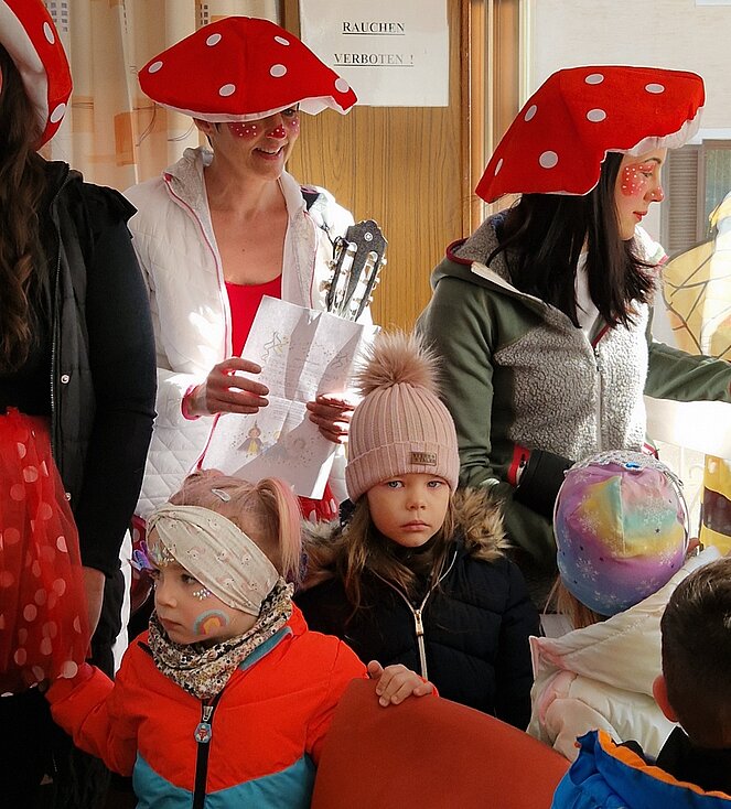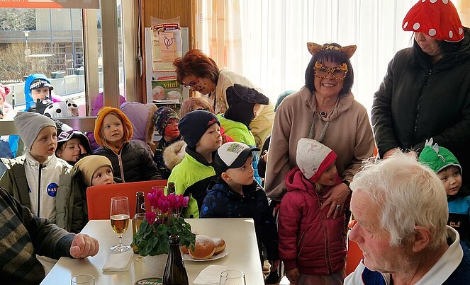 Beim Besuch von Kindern und Pädagoginnen des Kindergartens Spatzennest sowie der Pölser Faschingsmusik ging es am 4.3. im Vereinslokal hoch her. Die Kinder wurden mit Süßigkeiten verwöhnt, die Erwachsenen mit Getränken und Krapfen.