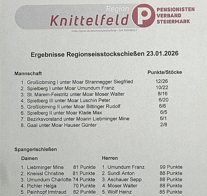 Die Regionsmeisterschaften fanden bei herrlichen Wetter auf den Eisbahnen in Lind statt. Regionsvorsitzende Helga Pichler begrüßte 8 Mannschaften zu je 5 Personen zu spannenden Bewerben in der Mannschaftswertung und zum Spangerlschießen.