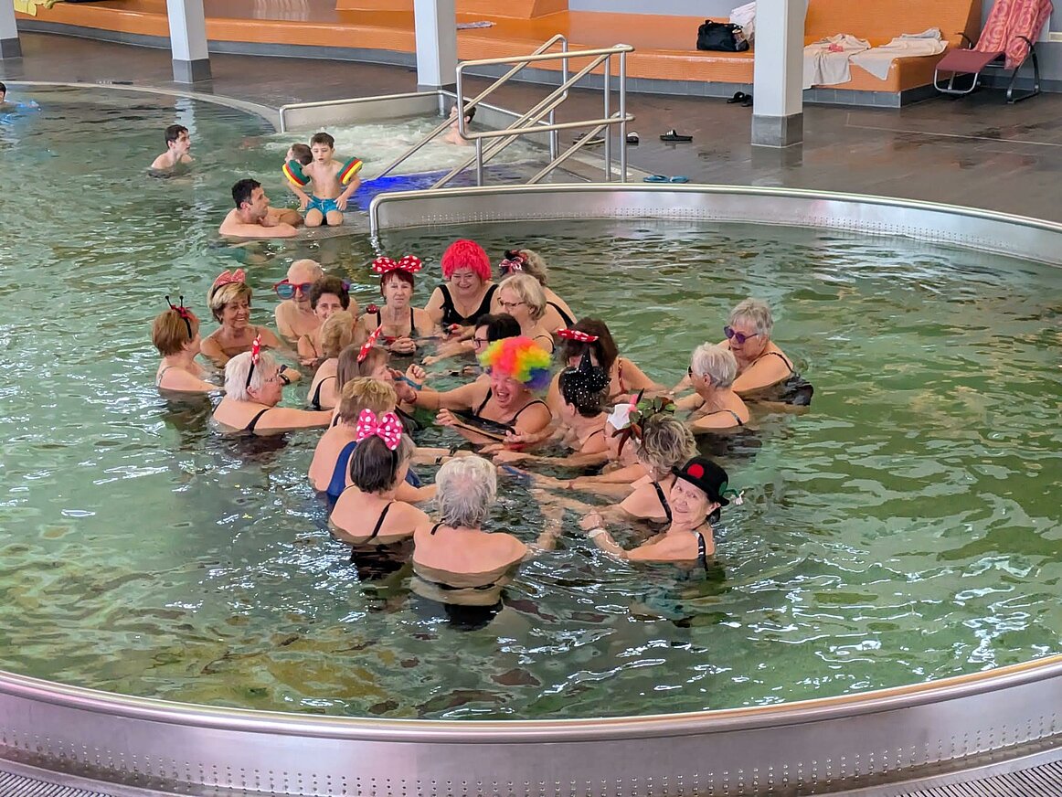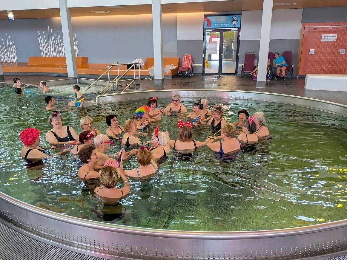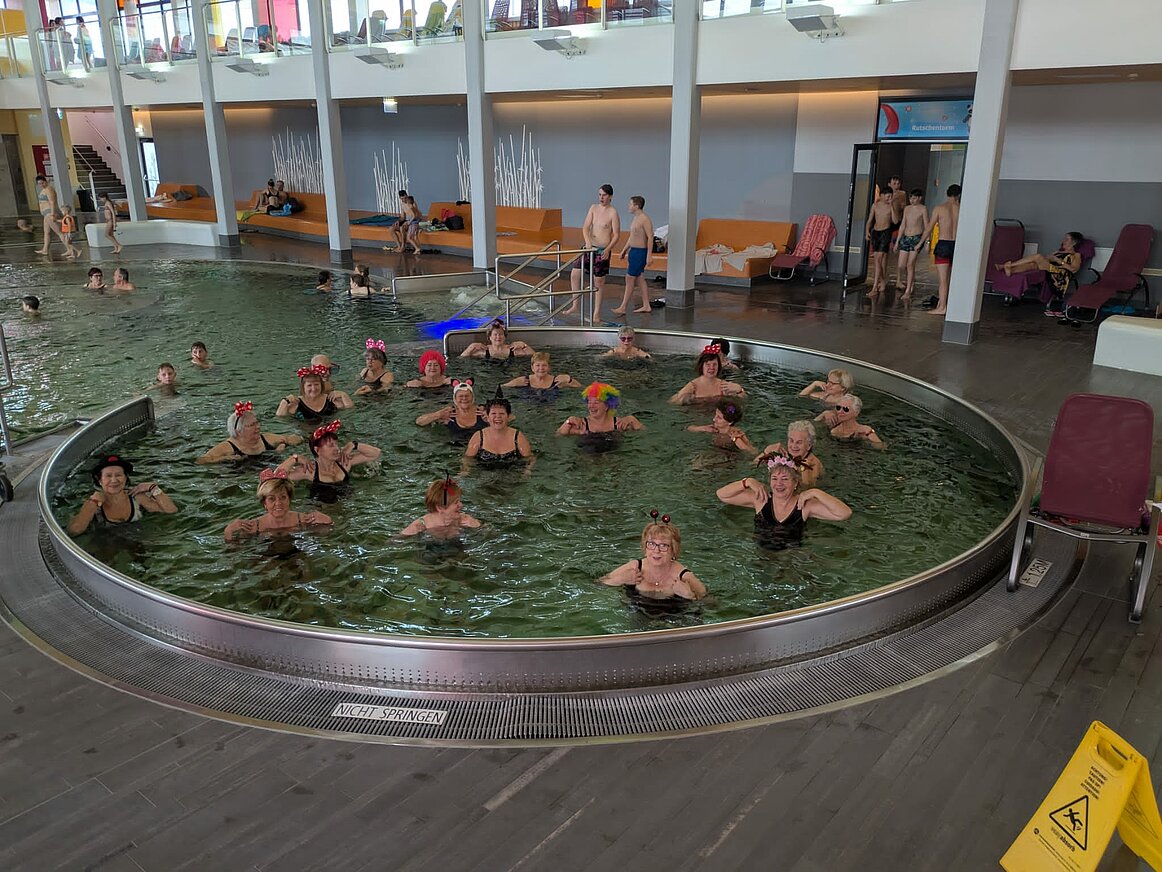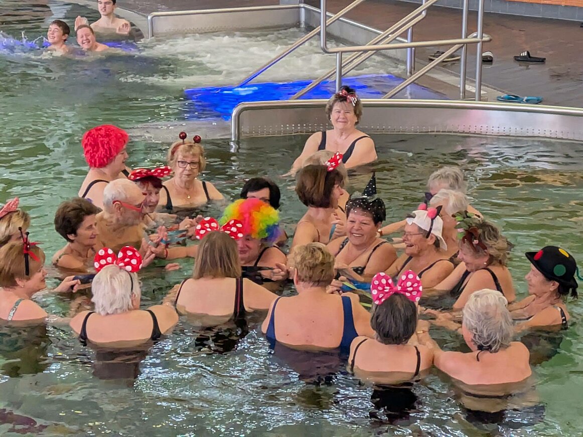 Wie jedes Jahr kamen wir zur Wassergymnastik mit lustiger Kopfbedeckung zusammen. Wir machten Fangspiele mit unseren Gummibändern, natürlich auch Lachjoga, mit echtem Lachen und freiwilligem Lachen, was uns viel Spaß bereitete. Bewegte Kinderlieder wurden gebrüllt, Beckenbodengymnastik mit Lauten und vielen Tänzchen, wo wir uns bewegt und gesungen haben. Anschließend setzten wir uns im Buffet zusammen um die Gemeinschaft „angezogen“ weiter zu pflegen.