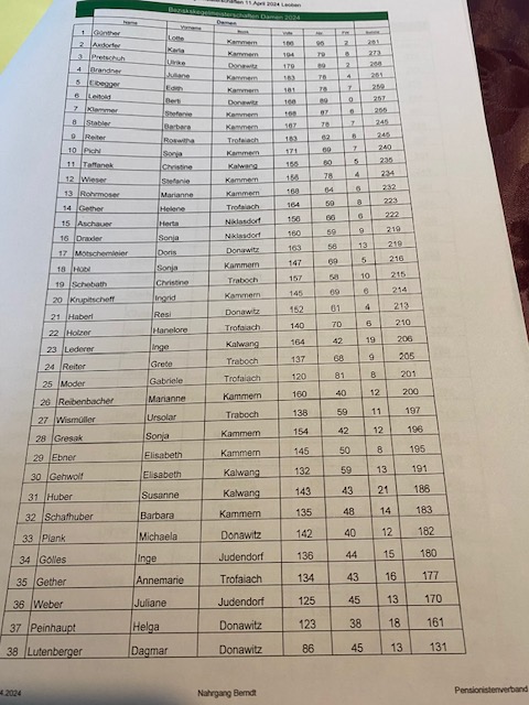 Bei der am 10. und 11. Juni in Liezen ausgetragenen Landeskegelmeisterschaft konnten die Damen aus dem Bezirk Leoben den 1. Platz erkegeln und sich somit für die im Oktober in Salzburg stattfindende Bundeskegelmeisterschaft qualifizieren. Wir gratulieren! Die Herrenmannschaft aus dem Bezirk erreichte den guten 4. Platz. Betreut wurden die Mannschaften von Herbert Moder und Johann Klammer.