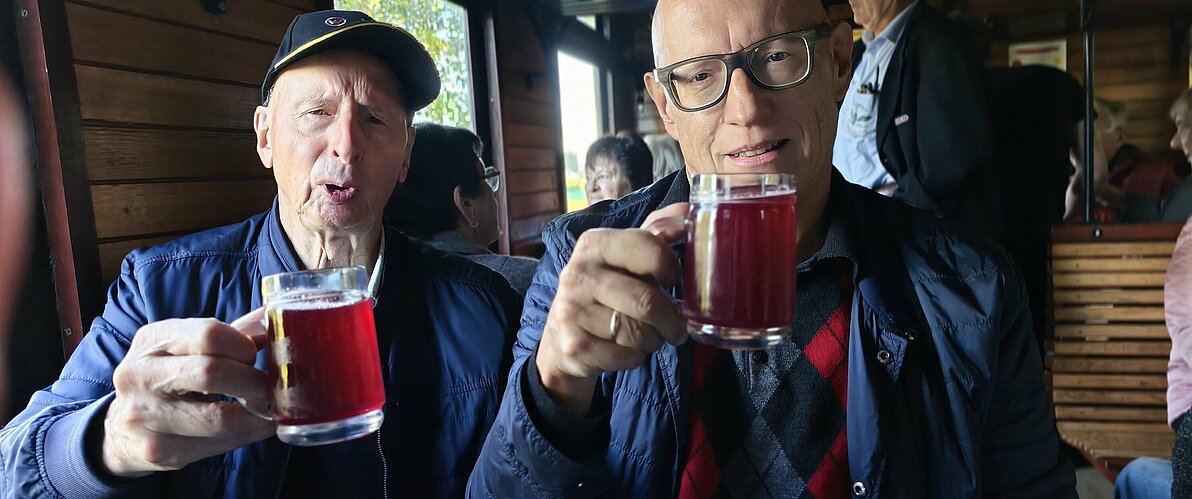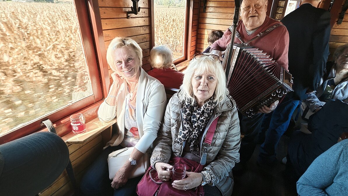 Während der Fahrt wurden wir bestens versorgt – mit allerlei Getränken, darunter natürlich der ausgezeichnete Schilcher-Sturm, und musikalisch begleitet von einem zünftigen Musikanten, der mit Gstanzln und Wunschliedern für Stimmung sorgte.