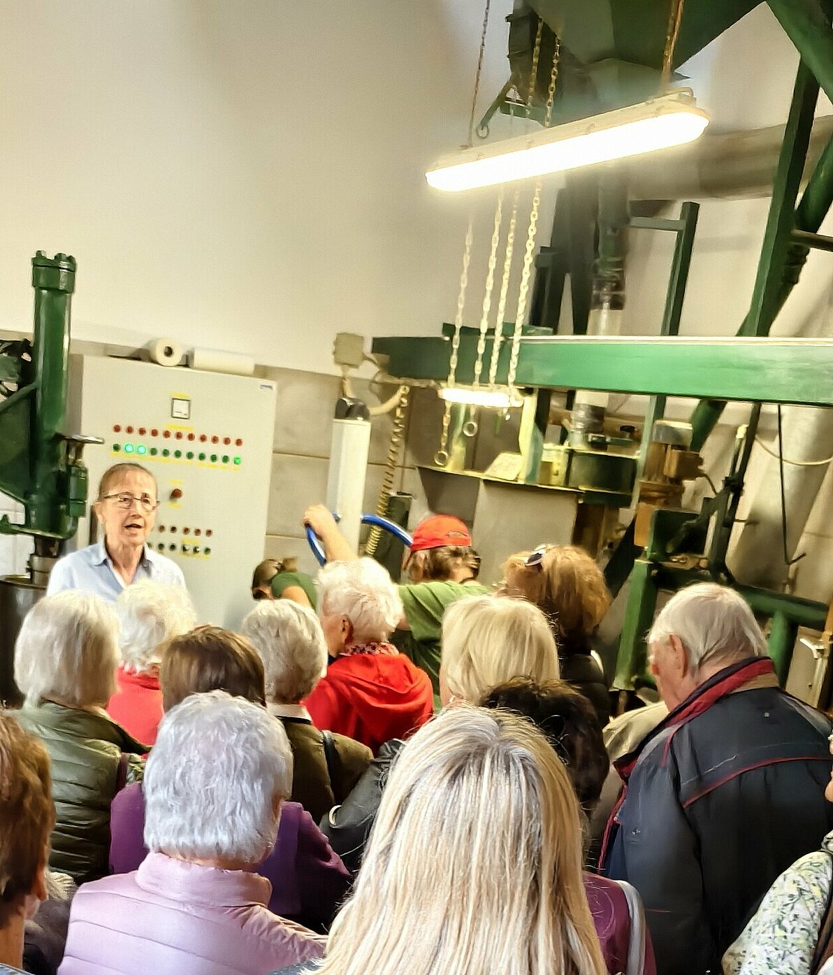 Die Hausherrin führte uns mit viel Fachwissen und Begeisterung durch den Betrieb und erklärte alles rund um den Anbau, die Ernte und die Verarbeitung des steirischen Ölkürbisses. Besonders spannend war der Blick in die hofeigene Ölpresse, wo wir live miterleben konnten, wie aus Kürbiskernen das kostbare Kürbiskernöl entsteht.
