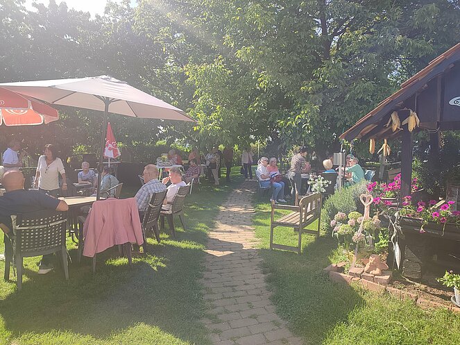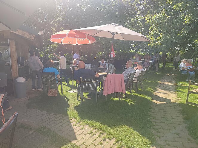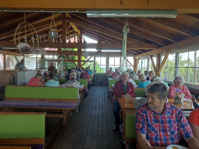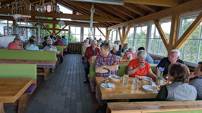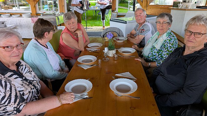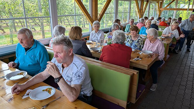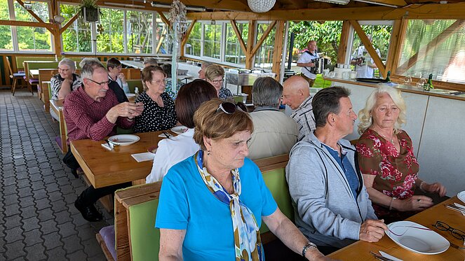 Gut gelaunt und bereits um einige neue Eindrücke reicher, machten wir uns im Anschluss auf den Weg zur nahegelegenen Bergschenke Gerersdorf, wo ein schmackhaftes Mittagessen auf uns wartete. Bei herrlichem Wetter, gemütlicher Atmosphäre und musikalischer Unterhaltung klang der Nachmittag stimmungsvoll aus. Einige ließen es sich nicht nehmen, bei der schwungvollen Musik ein Tänzchen aufs Parkett zu legen und so für heitere Momente zu sorgen.