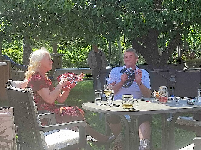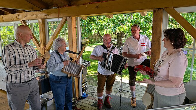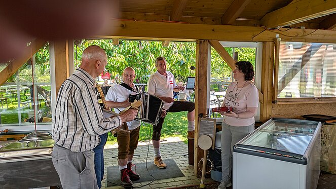Begleitet von schwungvoller Musik verbrachten wir einen heiteren Nachmittag. Für das leibliche Wohl war bestens gesorgt: Erfrischende Getränke standen bereit, und köstliche Krapfen versüßten uns den Tag.
