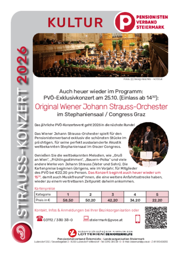 Die Kartenpreise beginnen übrigens, wie im Vorjahr, für Mitglieder des PVÖ bei €22,20 pro Person, die Preise der einzelnen Kategorien entnehmen Sie bitte dem Veranstaltungsflyer.