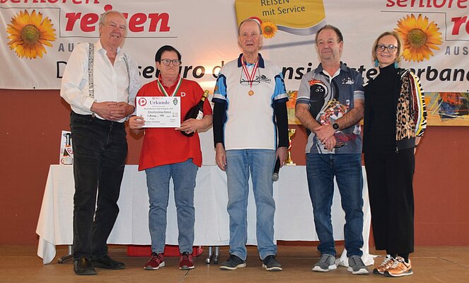 Aich bei der heurigen Bezirkskegelmeisterschaft unserer Region taten sich die Teilnehmenden aus Krieglach mit großartigen Leistungen hervor: Bei der Einzelwertung der Herren holte Franz Hofer mit 196 Kegel Gold nach Krieglach (der Herr in der Mitte mit Urkunde), bei der Einzelwertung der Damen sicherte sich Hermine Klammer mit 175 Kegel Bronze (die Dame rechts mit Urkunde).