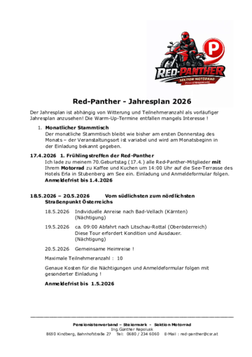Was im Vordergrund steht, sind die Begriffe Gemeinschaft, Ausfahrten und sichere Fahrpraxis. So sind für April/Mai bereits Fahrsicherheitstrainings reserviert. Weiters sind bereits einige Aus- und Rundfahrten (Halbtages- bis Mehrtagesfahrten) in Vorbereitung – und natürlich auch die bekannten, regelmäßigen Stammtische.