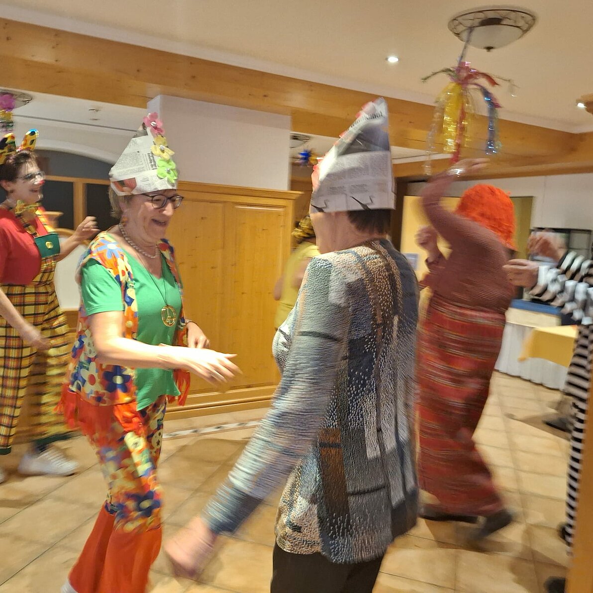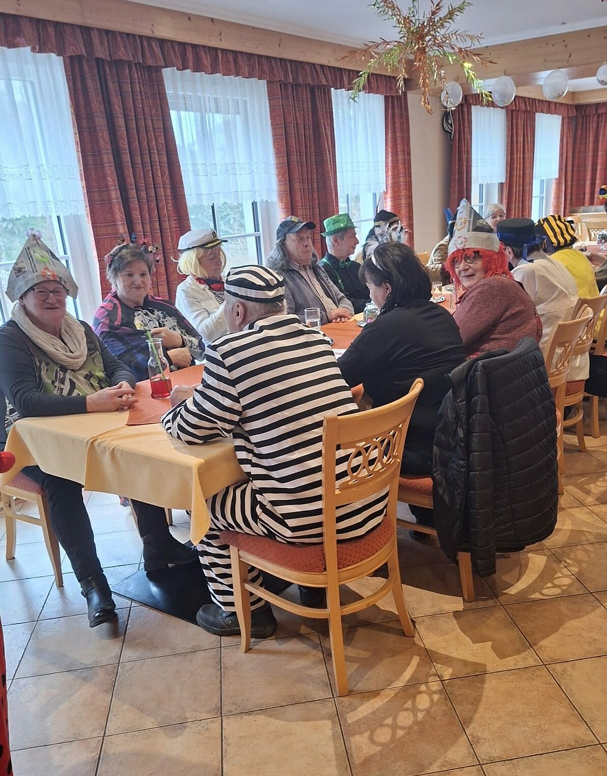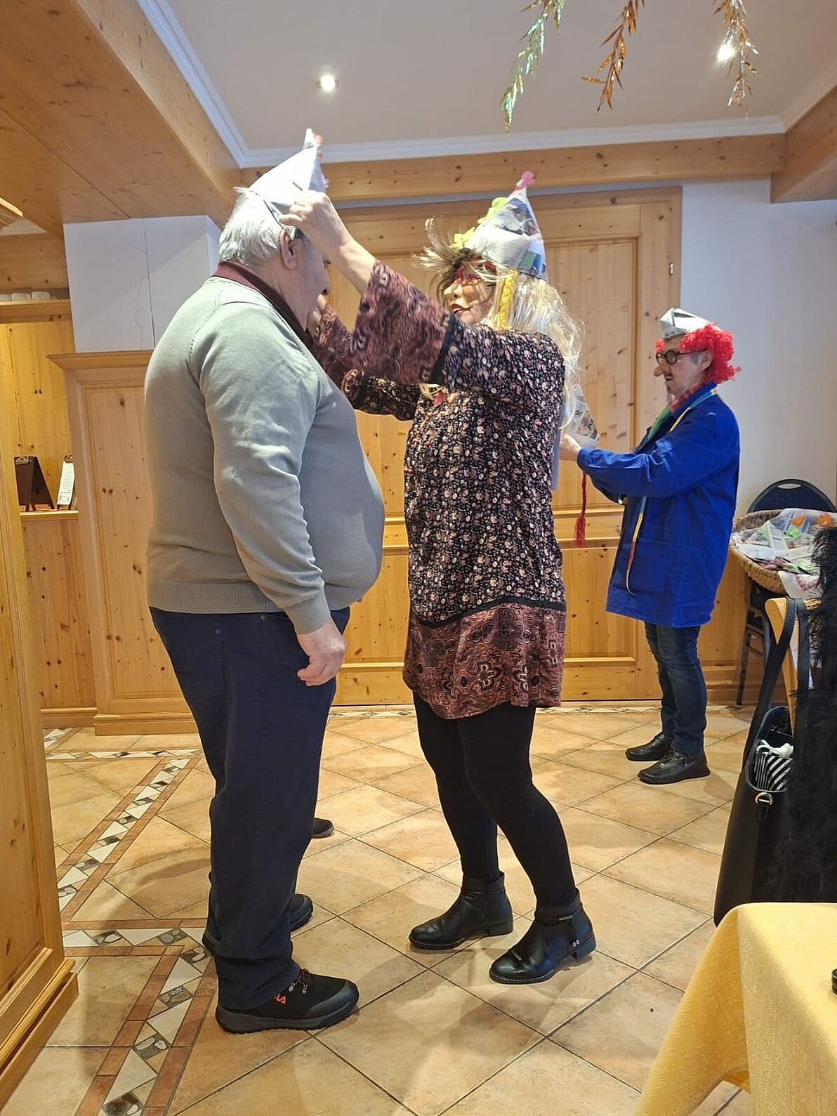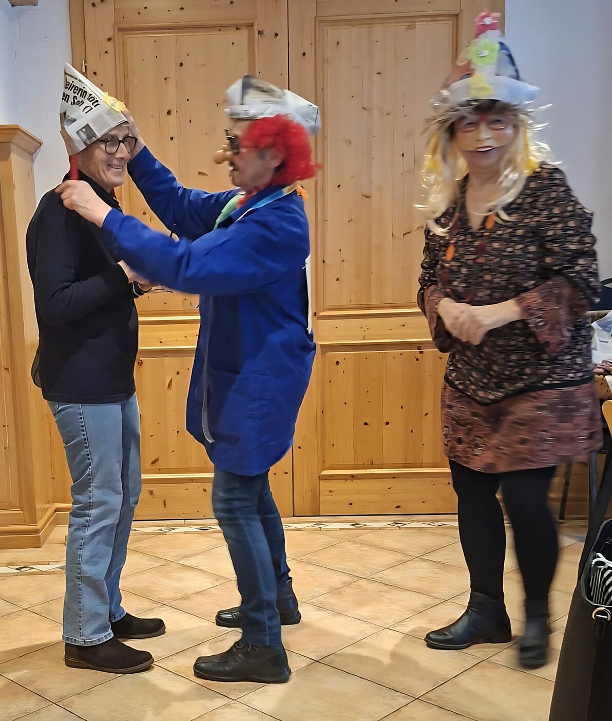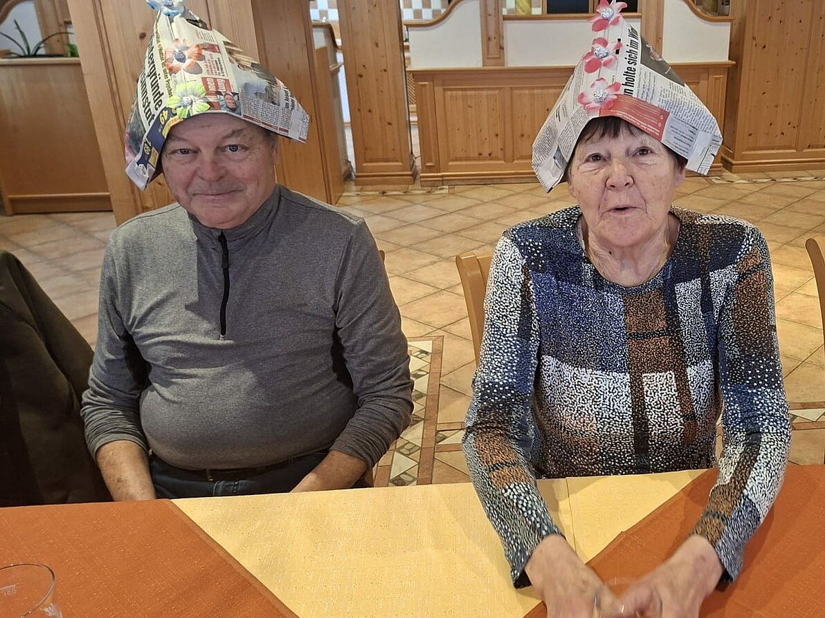 Gut ausgestattet brachten Meister Maria und Lehrling Poldi kreative handgefertigte, kreativ gestaltete Hüte mit – und so entstand schnell eine bunte, fantasievolle Faschingsrunde, bei der viel gelacht und getanzt wurde.